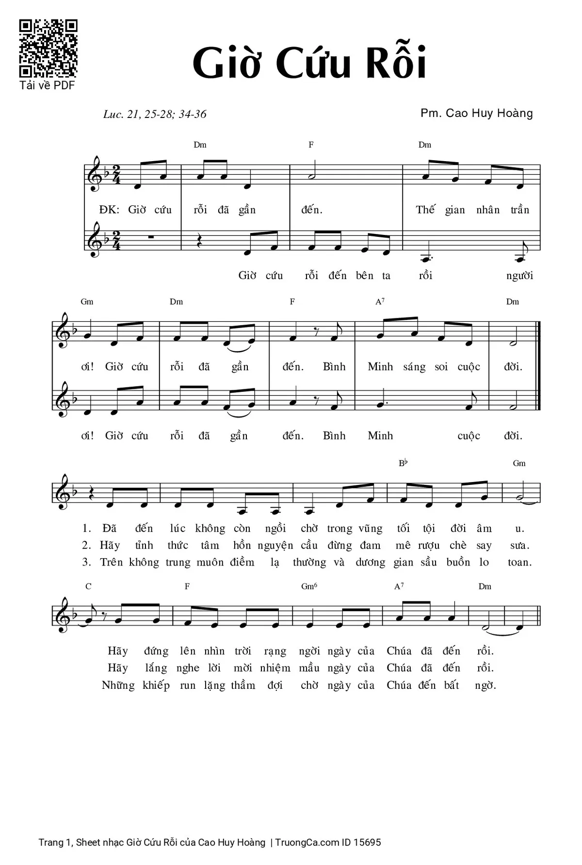 Điệp khúc. Giờ cứu rỗi đã gần đến. Thế gian nhân trần ơi! Giờ cứu rỗi đã gần đến. Bình Minh sáng soi cuộc đời.