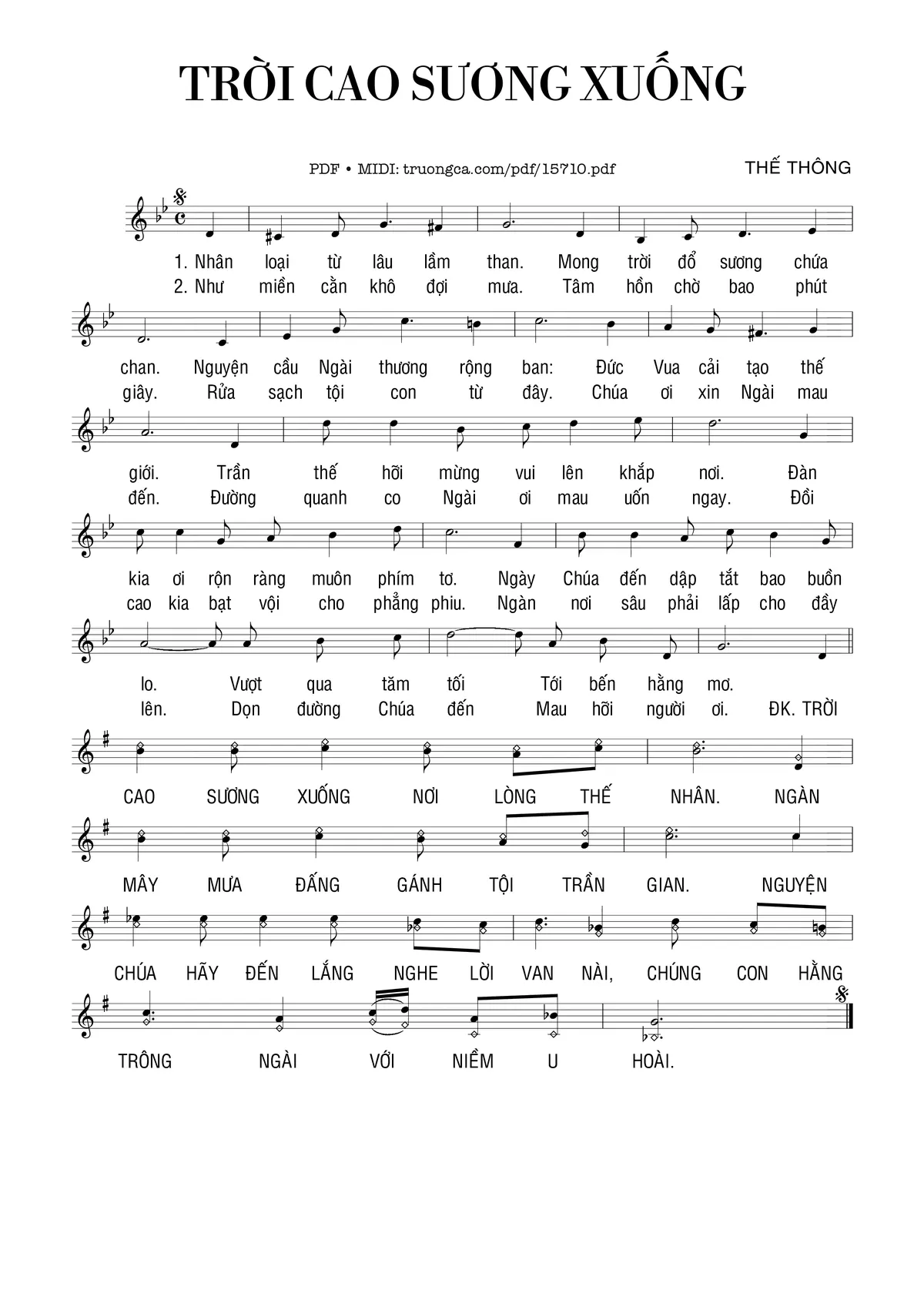 Điệp khúc. Trời cao sương xuống nơi lòng thế nhân Ngàn mây mưa Đấng gánh tội trần gian Nguyện Chúa hãy đến lắng nghe lời van nài chúng con hằng trông Ngài với niềm u hoài.