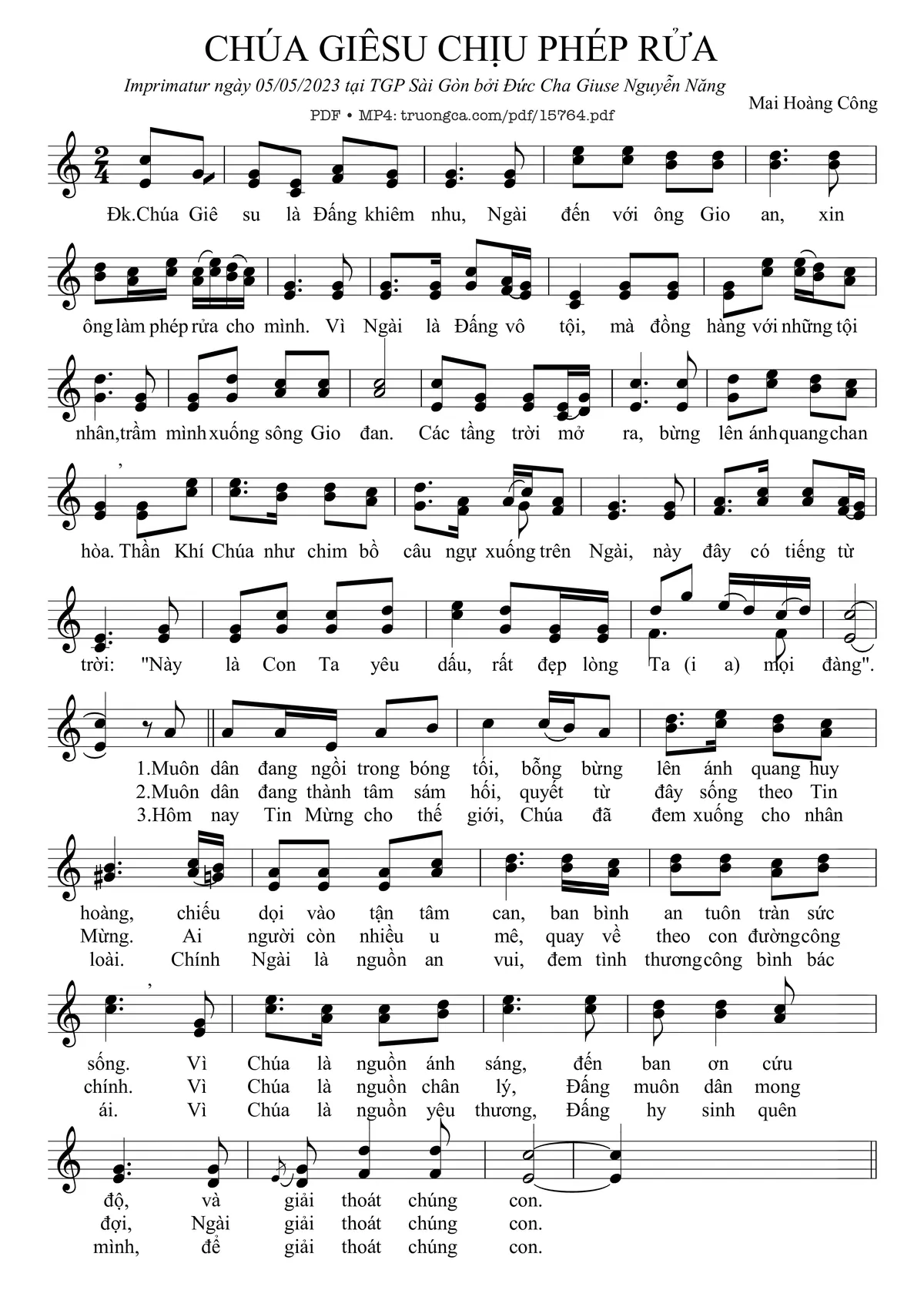 Điệp khúc. Chúa Giêsu là Đấng khiêm nhu, Ngài đến với ông Gioan, xin ông làm phép rửa cho mình. Vì Ngài là Đấng vô tội, mà đồng hàng với những tội nhân, trầm mình xuống sông Gio-đan. Các tầng trời mở ra, bừng lên ánh quang chan hòa, Thần Khí Chúa như chim bồ câu ngự xuống trên Ngài, này đây có tiếng từ trời: ‘Này là Con Ta yêu dấu, Con đẹp lòng Ta (i a) mọi đàng’.