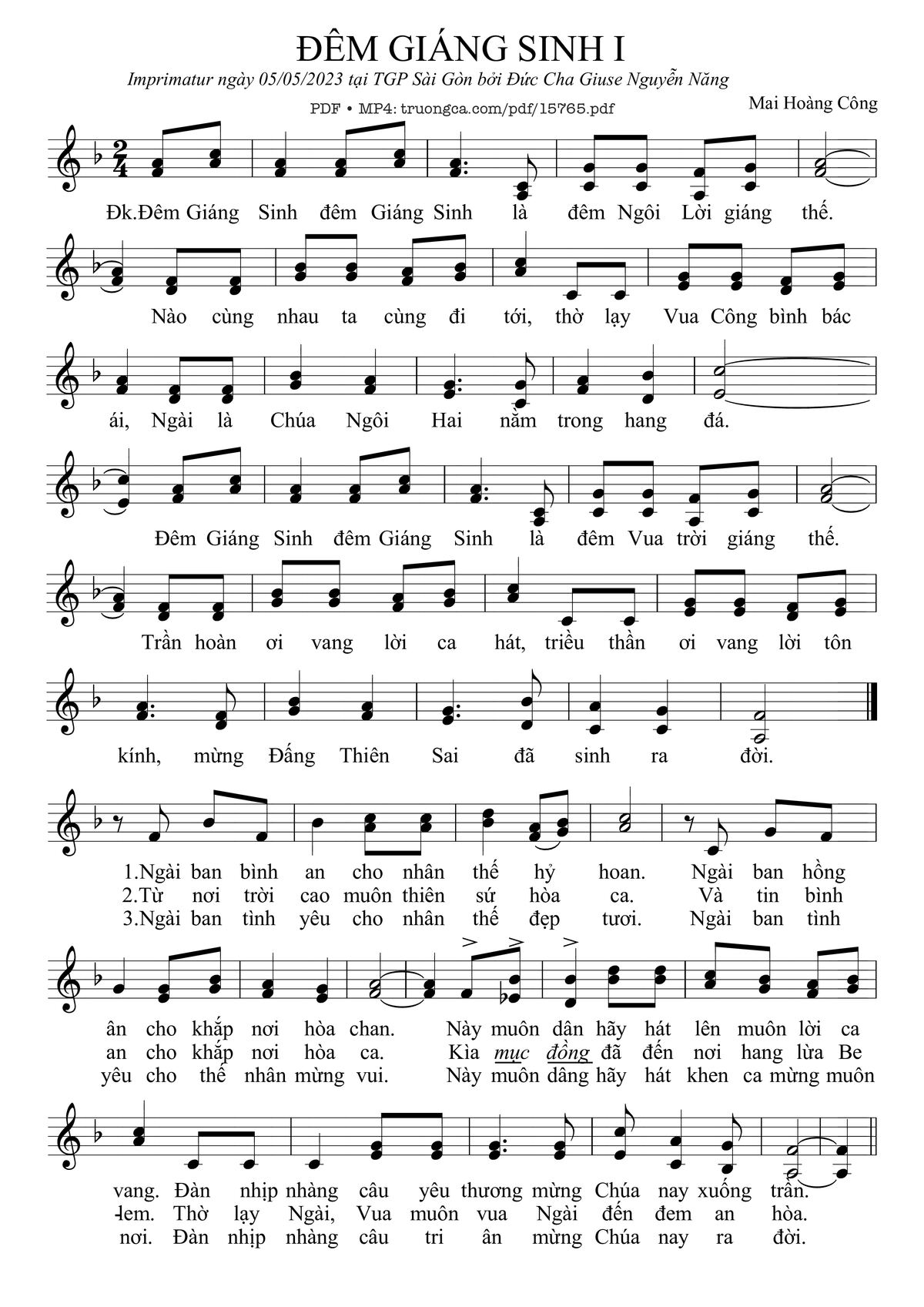 Điệp khúc. Đêm Giáng Sinh, đêm Giáng Sinh là đêm Ngôi Lời giáng thế. Nào cùng nhau ta cùng đi tới, thờ lạy Vua Công bình bác ái, Ngài là Chúa Ngôi Hai nằm trong hang đá. Đêm Giáng Sinh, đêm Giáng Sinh là đêm Vua trời giáng thế. Trần hoàn ơi vang lời ca hát, triều thần ơi vang lời tôn kính, mừng Đấng Thiên Sai đã sinh ra đời.