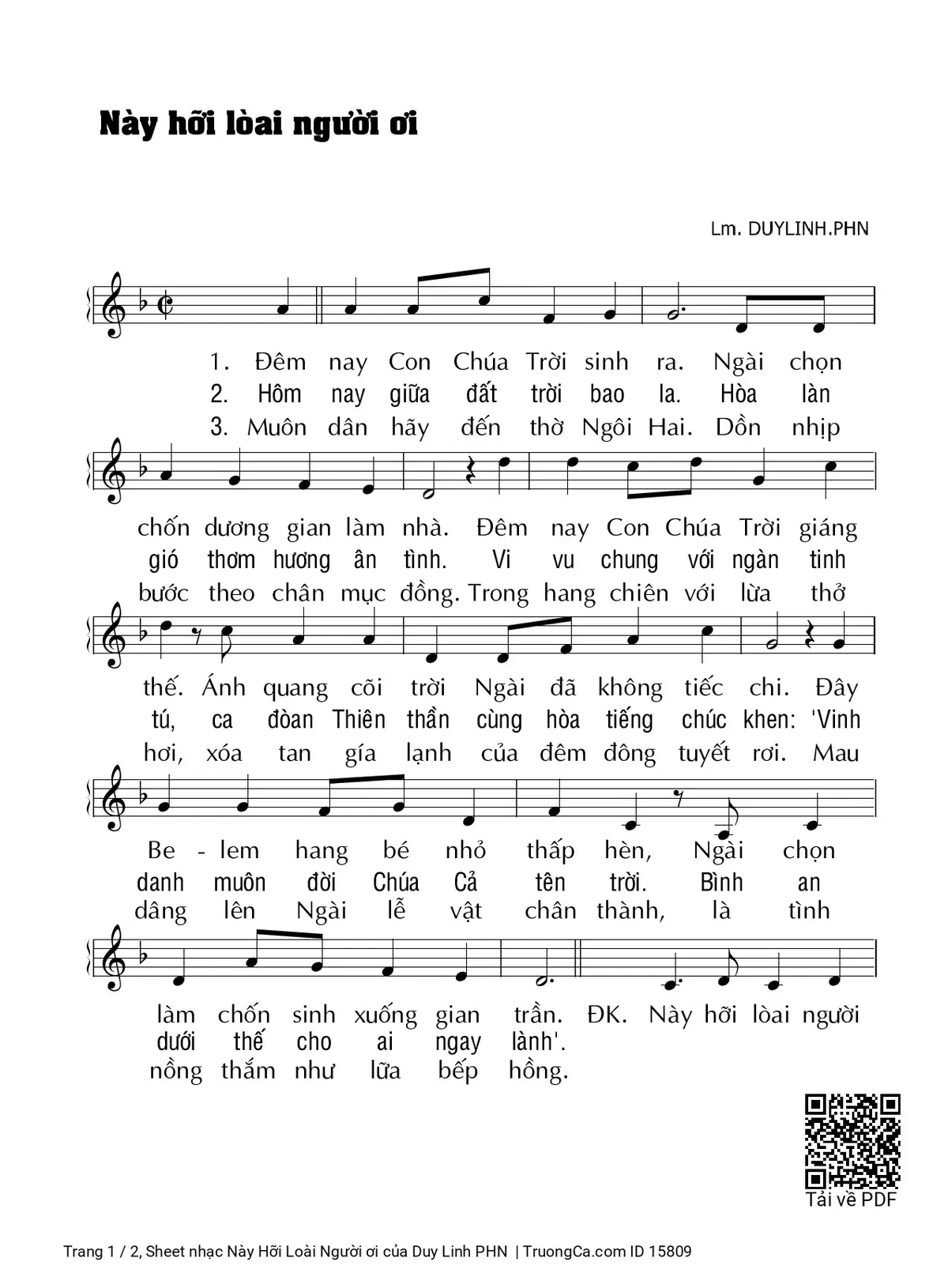 Điệp khúc. Này hỡi loài người ơi. Hãy dâng lời hát ca mừng Chúa ta nay đã sinh ra. Chúa đến cứu nhân loại. Và ban cho niềm vui mới. Hãy mở lòng đón nhận Hồng Ân.