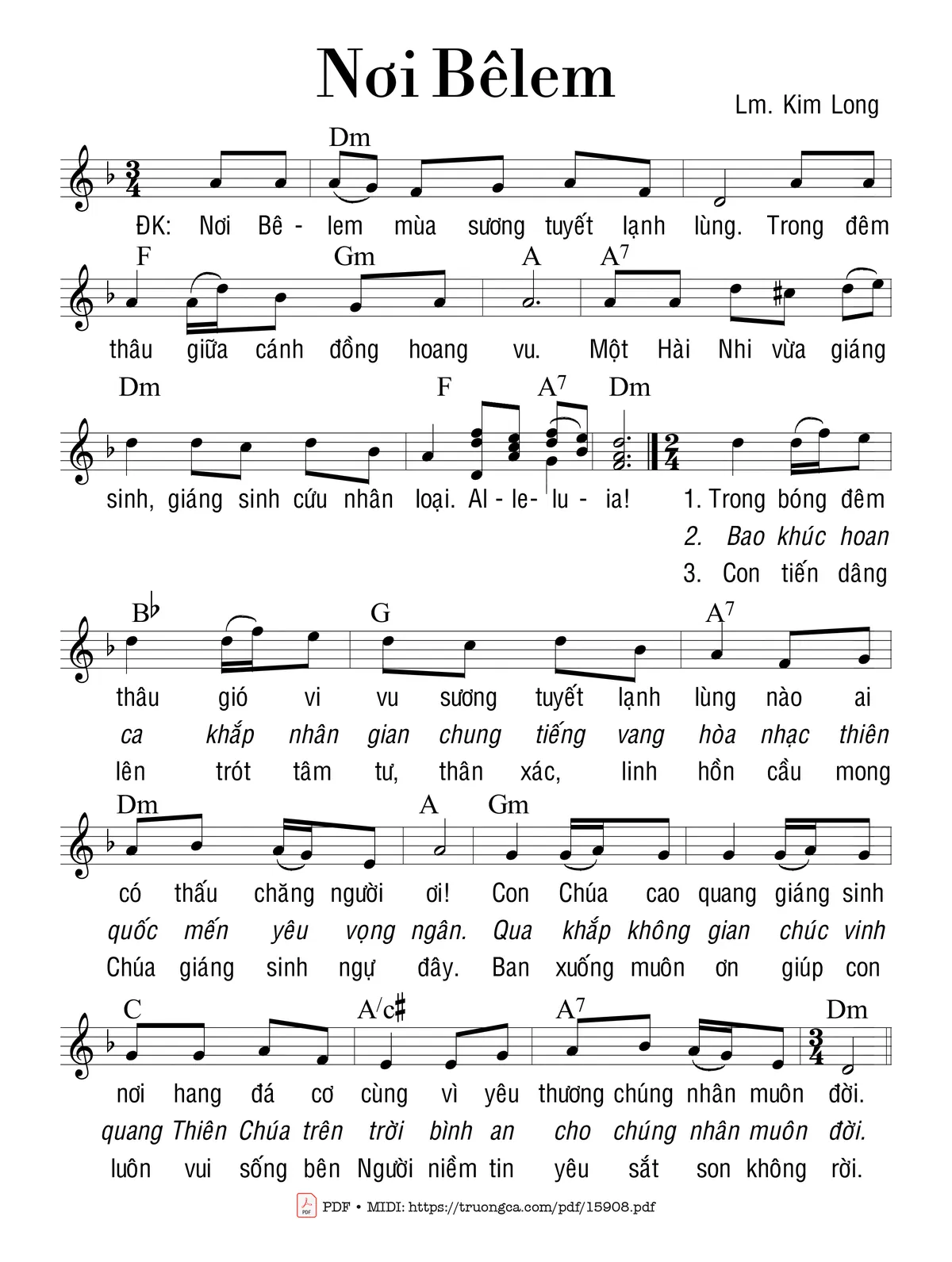 Chọn nút dấu + để tăng tông lên nửa cung, nút dấu - để giảm tông xuống nửa cung. Rê chuột vào hợp âm để xem các thế bấm hợp âm của bài hát Nơi Bêlem.