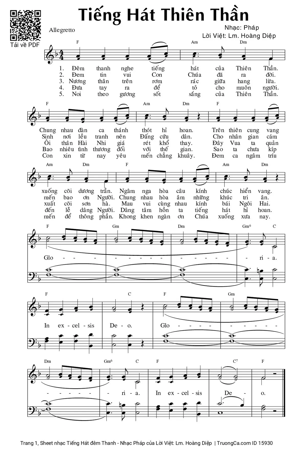 1. Đêm thanh nghe tiếng hát của Thiên Thần. Chung nhau đàn ca thánh thót hỷ hoan. Trên thiên cung vang xuống cõi dương trần. Ngân nga hoà câu kính chúc hiển vang.