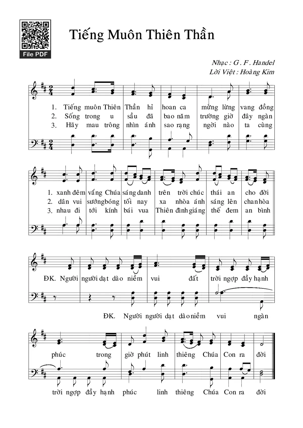 1. Tiếng muôn thiên thần hỉ hoan ca mừng lừng vang đồng xanh đêm vắng. Chúa sáng danh trên trời chúc thái an cho đời.