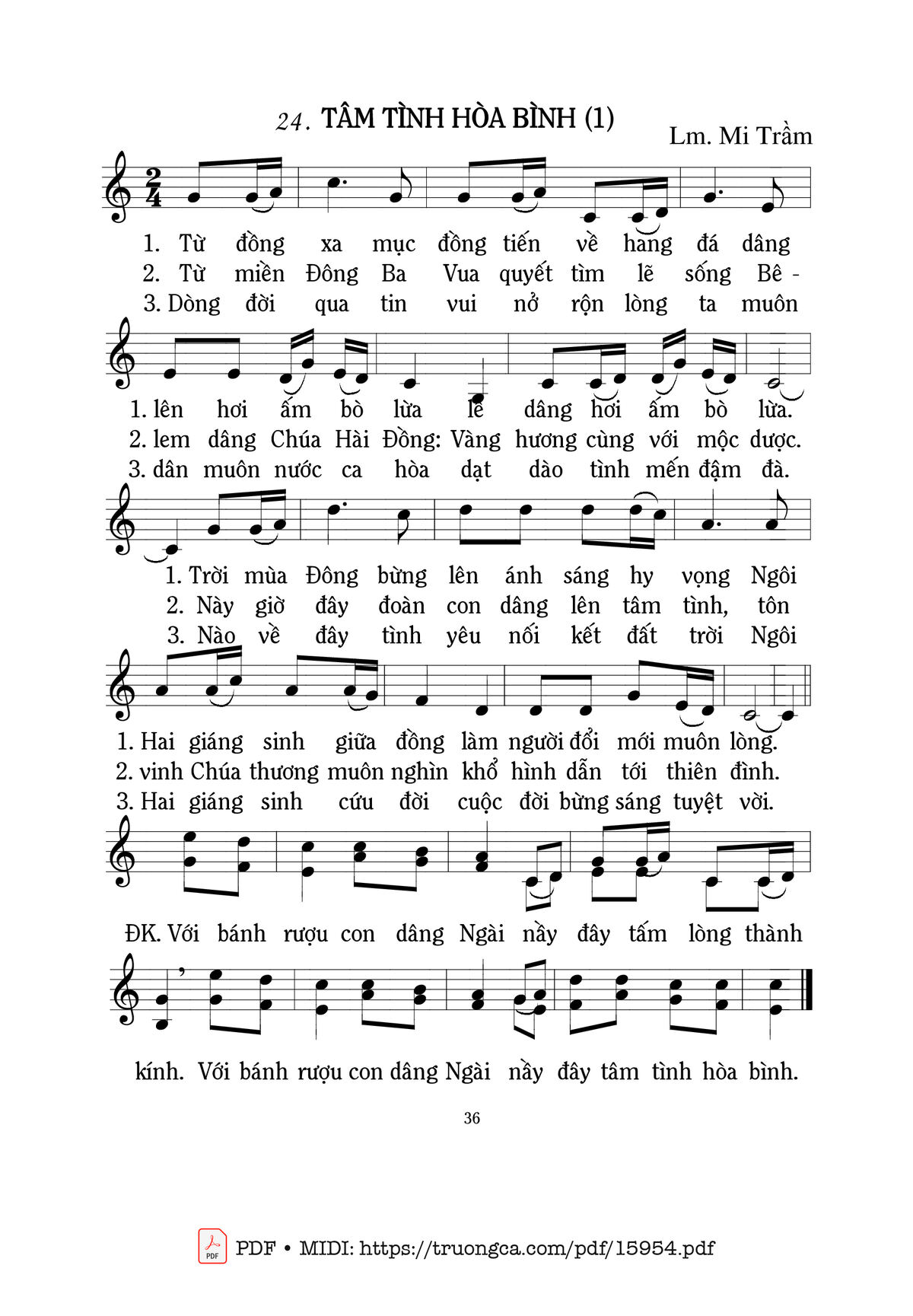 1. Từ đồng xa mục đồng tiến về hang đá dâng lên hơi ấm bò lừa lễ dâng hơi ấm bò lừa. Trời hừng đông bừng lên ánh sáng hy vọng, Ngôi Hai giáng sinh giữa đồng làm người đỗi mới muôn lòng.