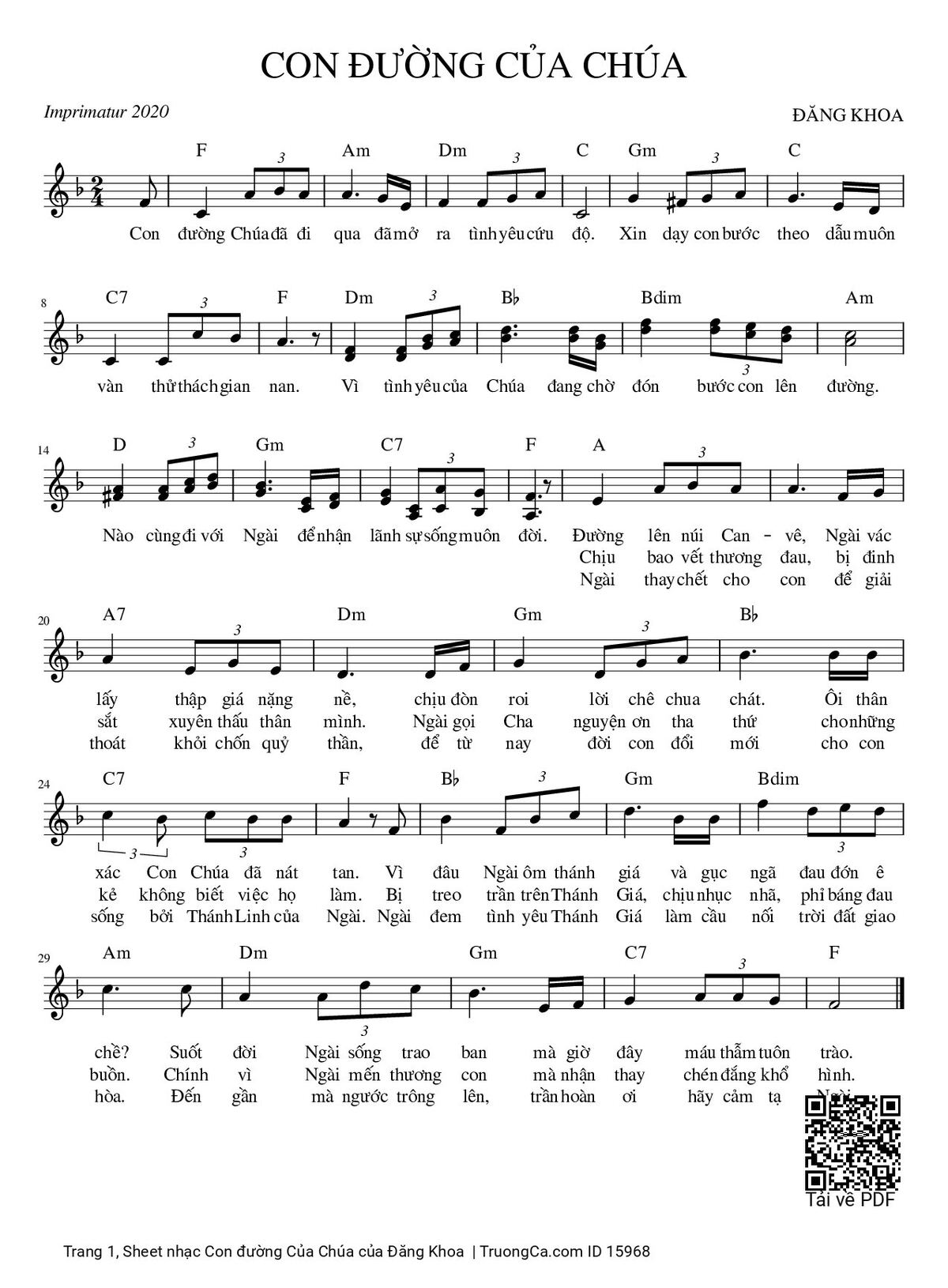 Điệp khúc. Con đường Chúa đã đi qua đã mở ra tình yêu cứu độ. Xin dạy con bước theo dẫu muôn vàn thử thách gian nan. Vì tình yêu của Chúa đang chờ đón bước con lên đường. Nào cùng đi với Ngài để nhận lãnh sự sống muôn đời.