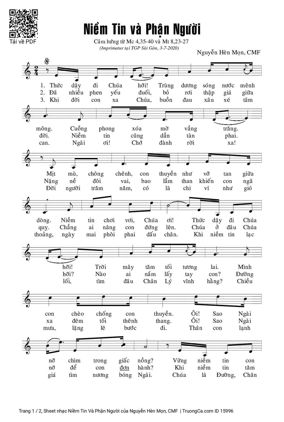 1/ Thức dậy đi Chúa hỡi! Trùng dương sóng nước mênh mông. Cuồng phong xóa mờ vầng trăng. Mịt mù, chông chênh, con thuyền như vỡ tan giữa dòng. Niềm tin chơi vơi, Chúa ơi! Thức dậy đi Chúa hỡi! Trời mây tăm tối tương lai. Mình con chèo chống con thuyền. Ôi sao Ngài nỡ chìm trong giấc nồng? Vững niềm tin con hỡi! Này đây Ta vẫn bên con. Lòng Ta chẳng hề ngủ say. Dẫu người mẹ quên con, nhưng tình Ta vẫn không đổi dời, một lòng yêu con say đắm say! Ngước nhìn lên Thiên Chúa lòng tin vươn thấu trời cao. Trùng dương yên lặng giông tố khi tâm hồn lắng đọng lời kinh chứa chan niềm tin.