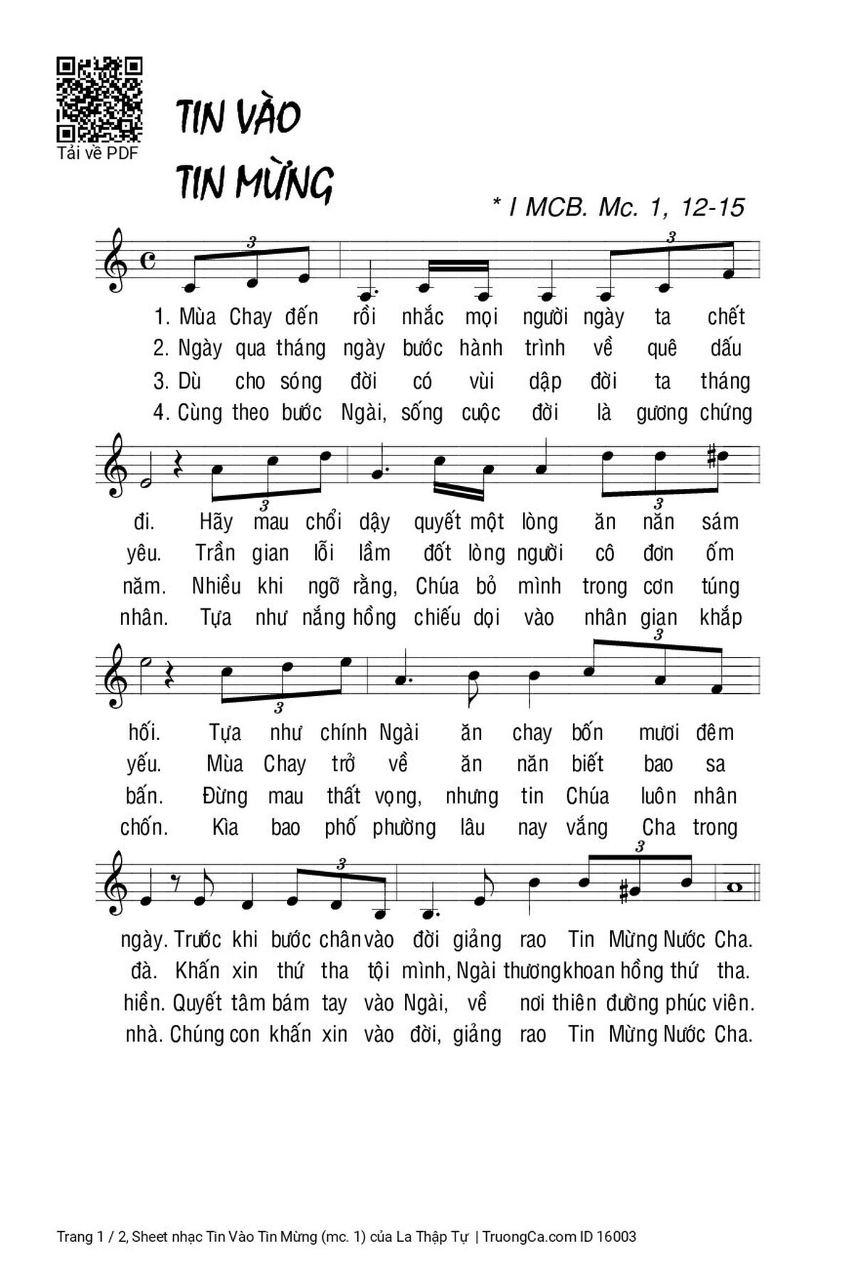 Các sheet PDF tương tự Tin Vào Tin Mừng (mc. 1):