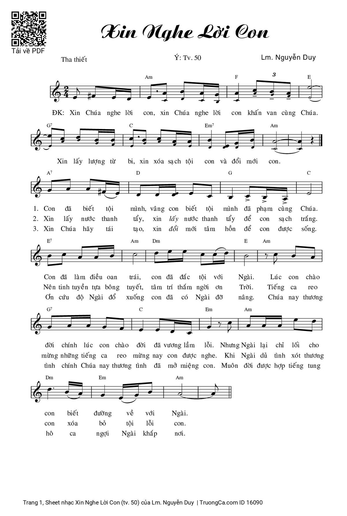 Điệp khúc. Xin Chúa nghe lời con, xin Chúa nghe lời con khấn van cùng Chúa. Xin lấy lượng từ bi, xin xóa sạch tội con và đổi mới con.