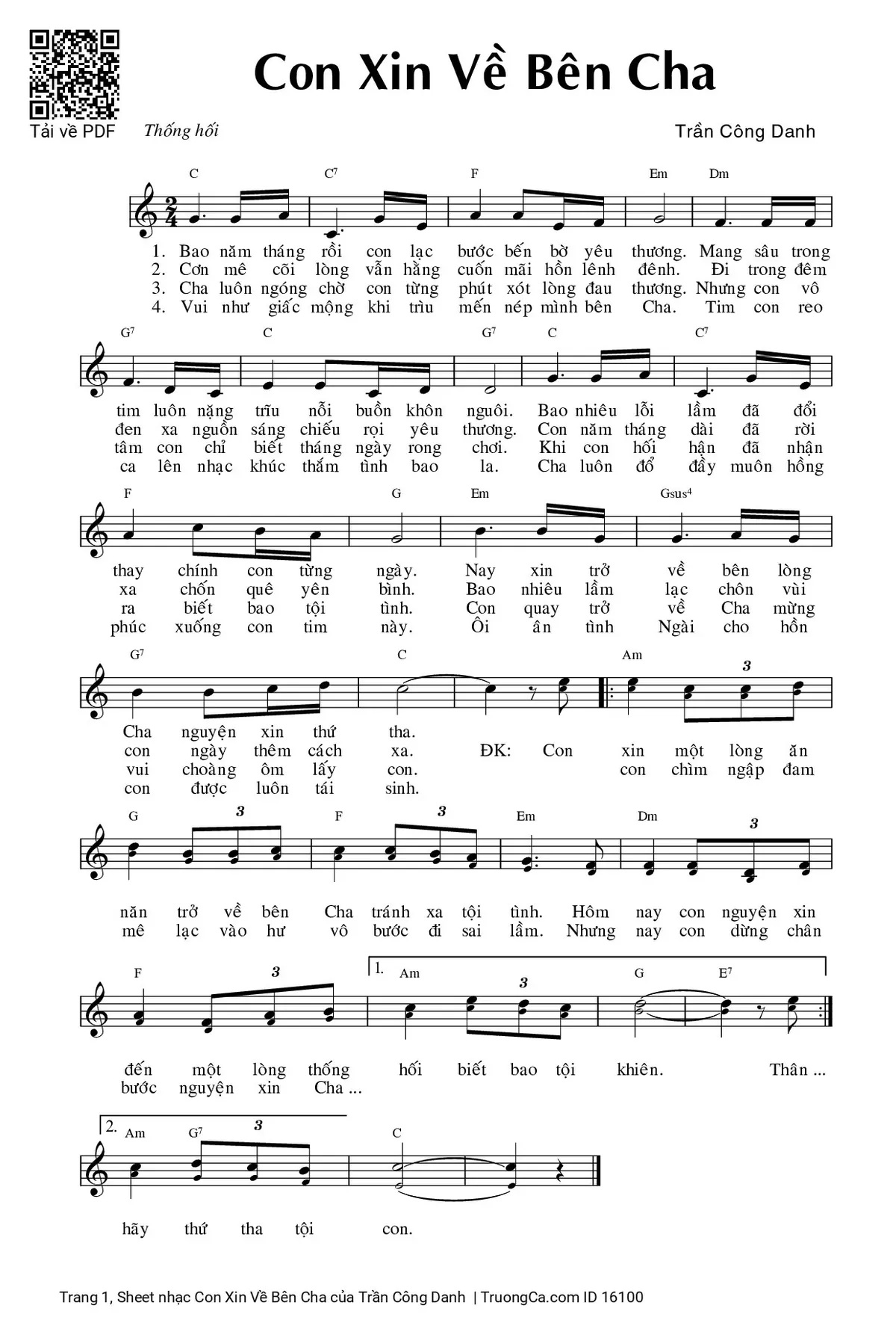 Điệp khúc: Con xin một lòng ăn năn trở về bên Cha tránh bao tội tình. Hôm nay con nguyện xin đến một lòng thống hối biết bao tội khiên. Thân con chìm ngập đam mê lạc vào hư vô bước đi sai lầm. Nhưng nay con dừng chân bước nguyện xin Cha hãy thứ tha tội con.