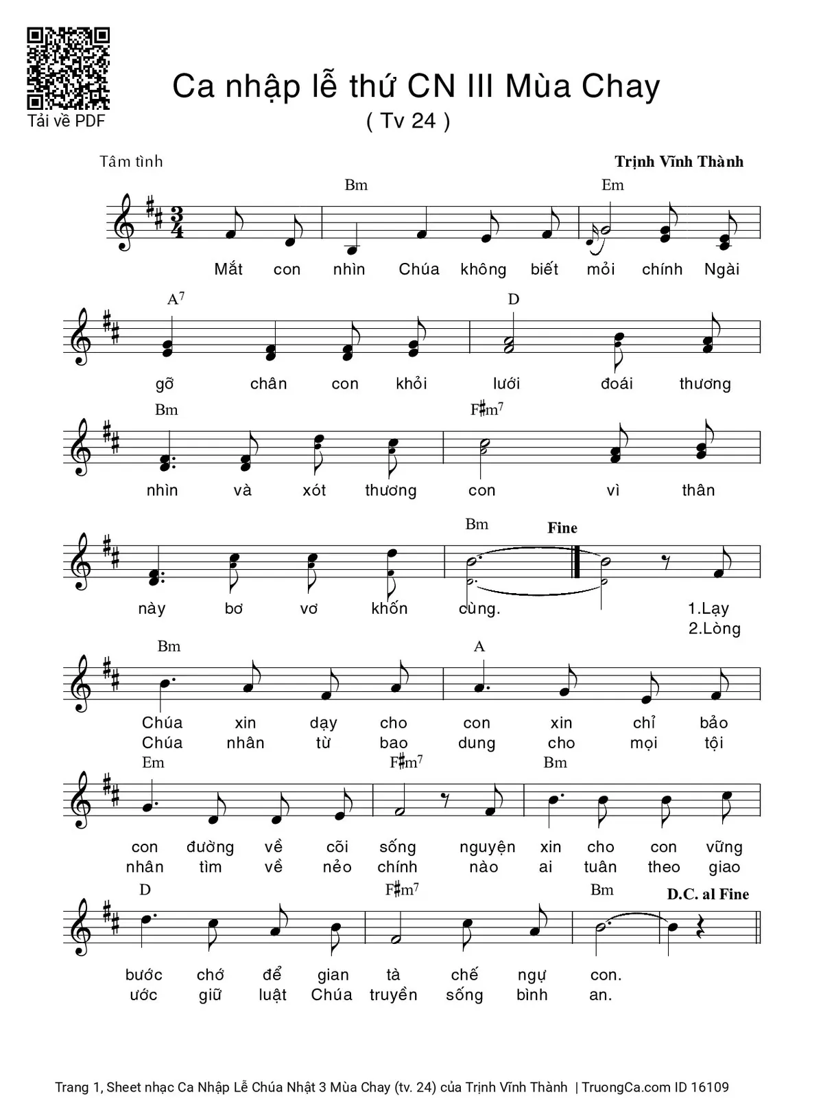 Điệp khúc. Mắt con nhìn Chúa không biết mỏi, chính Ngài gỡ chân con khỏi lưới. Đoái thương nhìn và xót thương con, vì thân này bơ vơ khốn cùng.