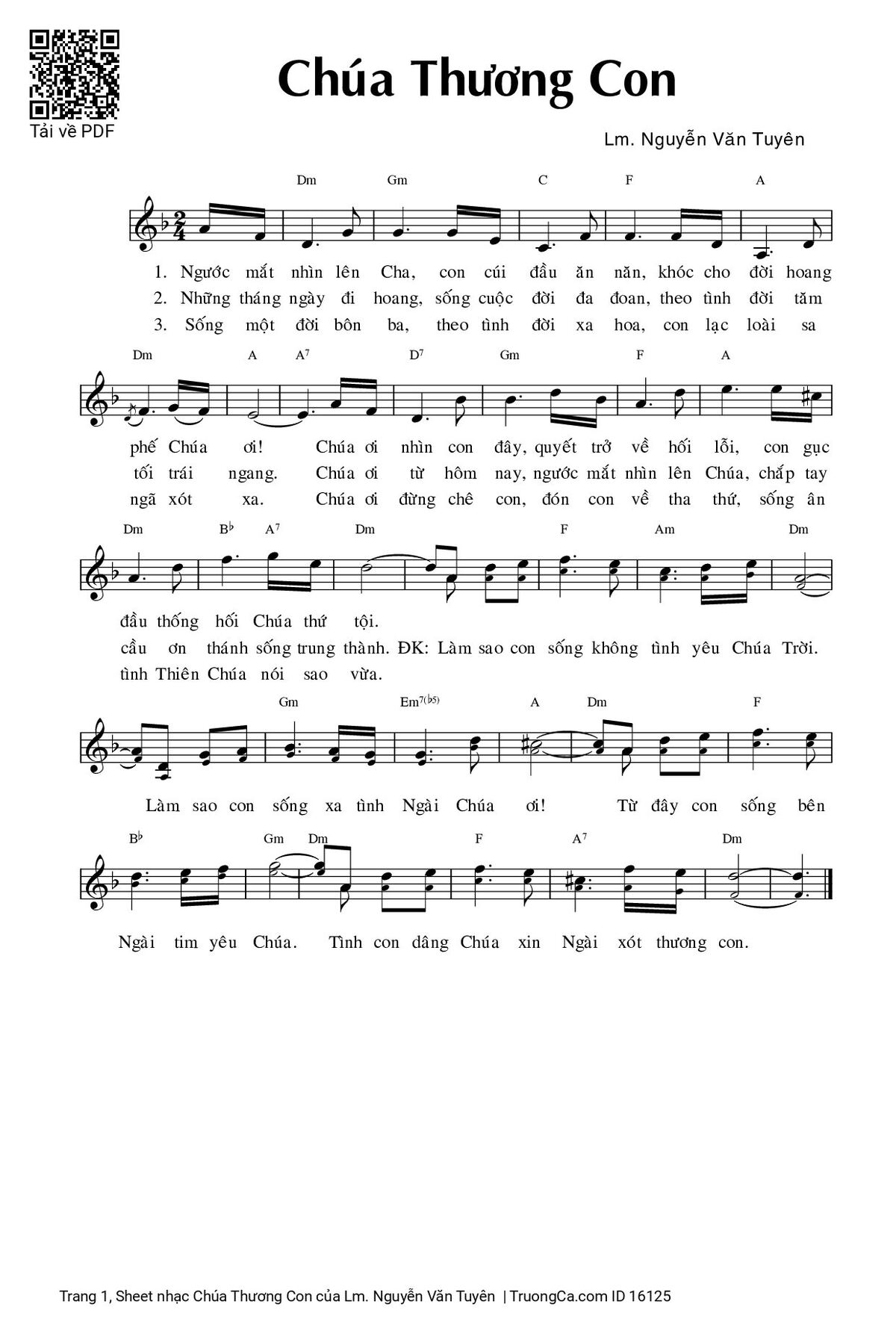 Chọn nút dấu + để tăng tông lên nửa cung, nút dấu - để giảm tông xuống nửa cung. Rê chuột vào hợp âm để xem các thế bấm hợp âm của bài hát Chúa Thương Con.