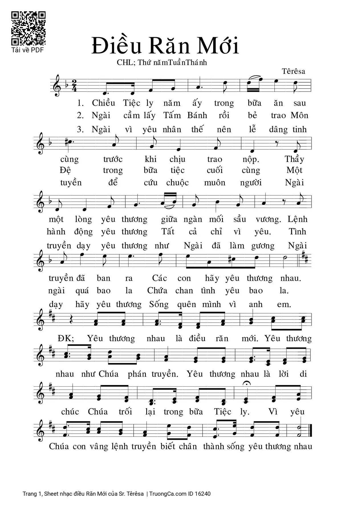 Điệp khúc. Yêu thương nhau là điều răn mới. Yêu thương nhau như Chúa phán truyền. Yêu thương nhau là lời di chúc. Chúa trối lại trong bữa Tiệc Ly. Vì yêu Chúa con vâng lệnh truyền, biết chân thành sống yêu thương nhau.
