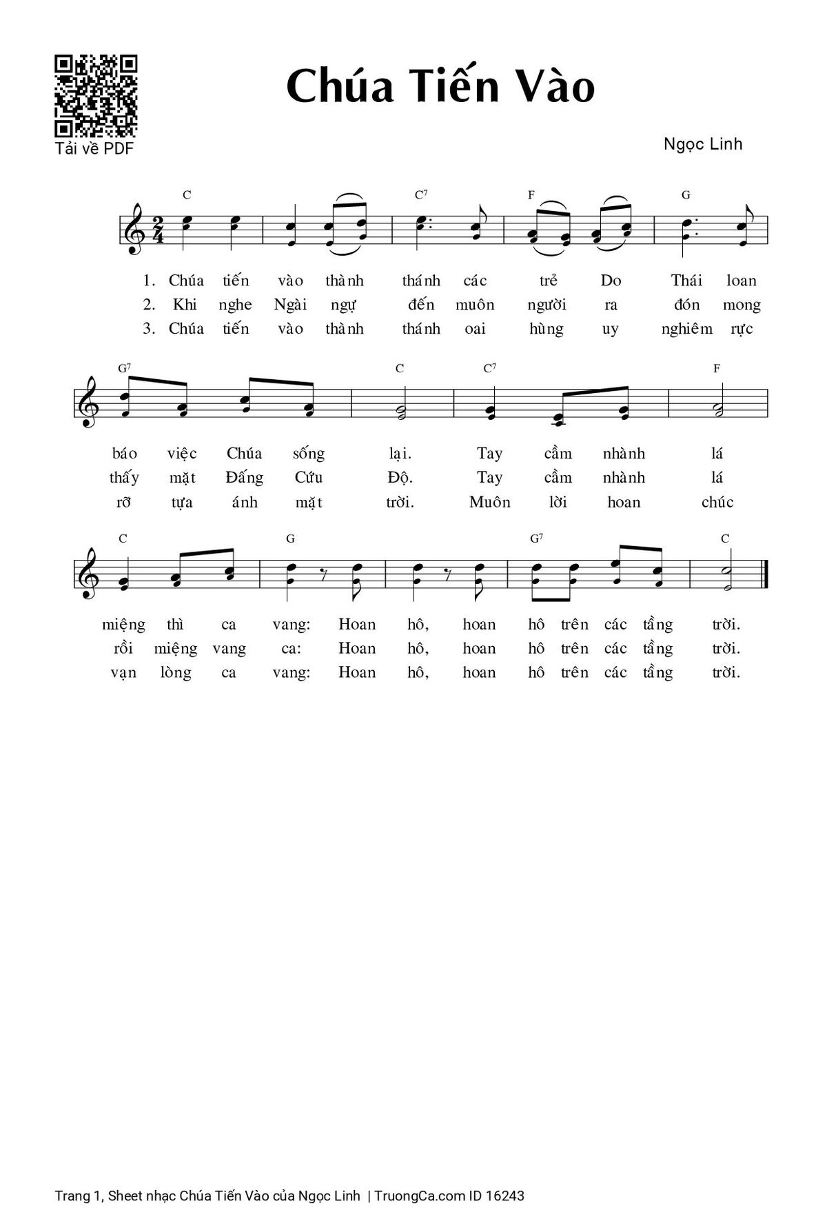 3. Chúa tiến vào thành thánh oai hùng uy nghiêm rực rỡ tựa ánh mặt trời. Muôn lời hoan chúc vạn lòng ca vang: Hoan hô, hoan hô trên các tầng trời.