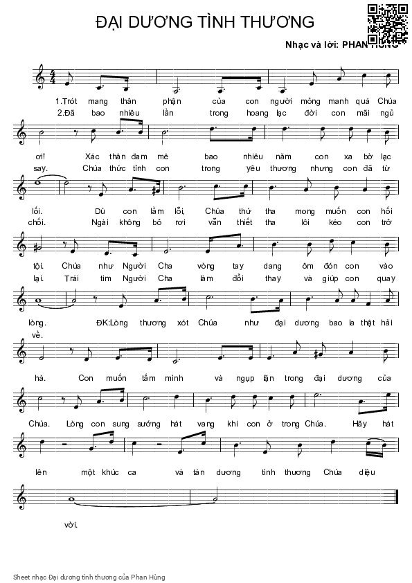 Chọn nút dấu + để tăng tông lên nửa cung, nút dấu - để giảm tông xuống nửa cung. Rê chuột vào hợp âm để xem các thế bấm hợp âm của bài hát Đại dương tình thương.