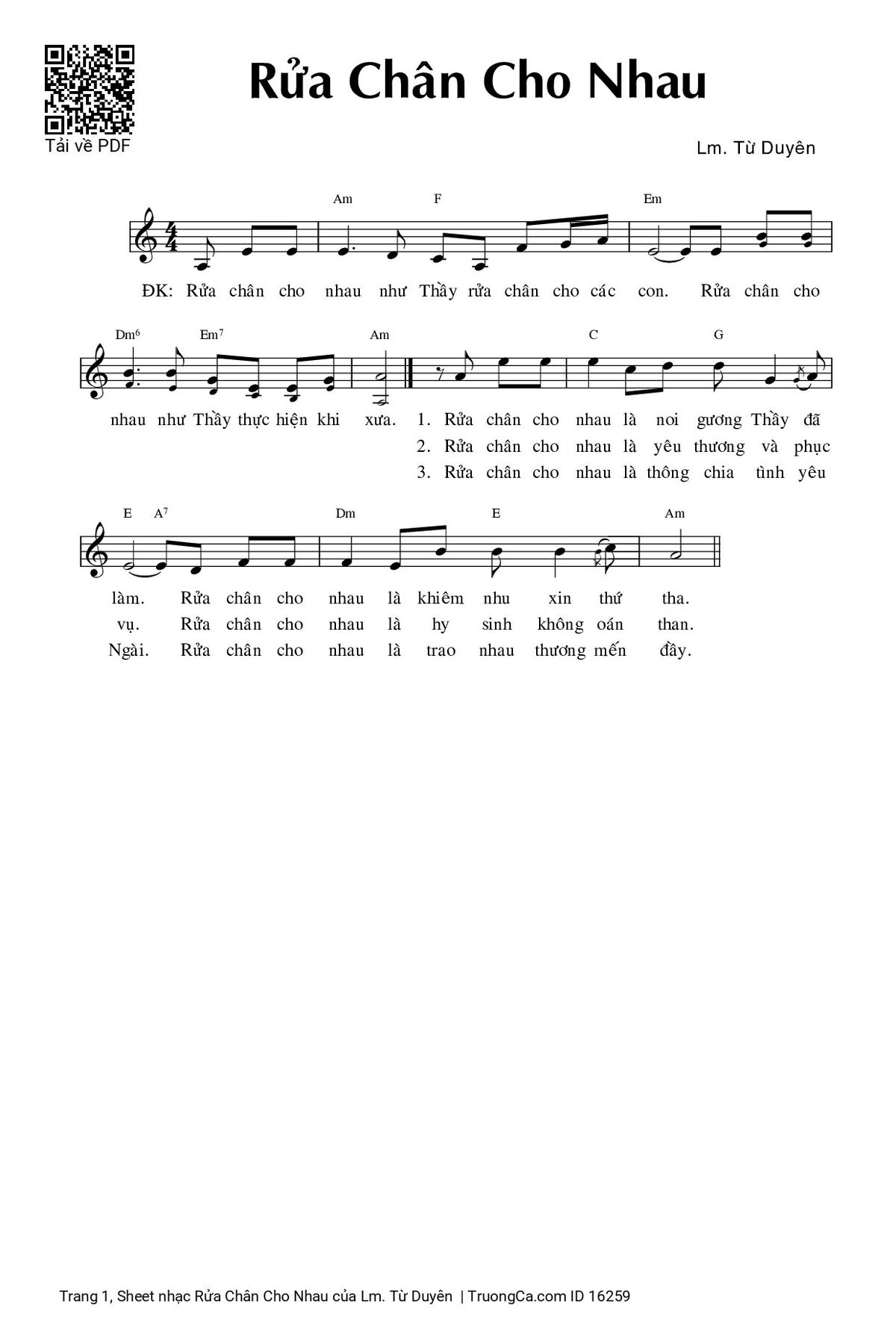 Điệp khúc: Rửa chân cho nhau như Thầy rửa chân cho các con. Rửa chân cho nhau như Thầy thực hiện khi xưa.