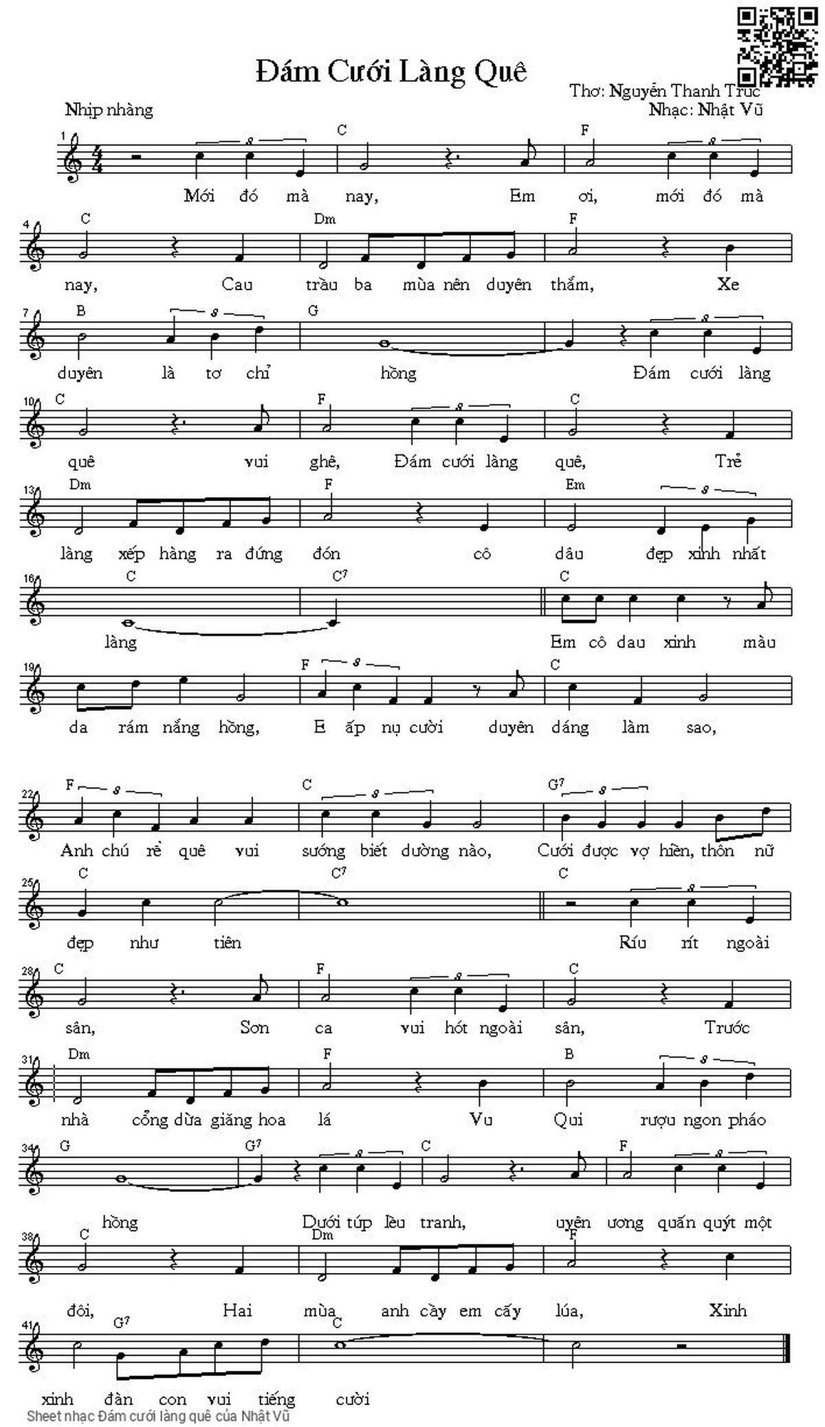 Phần nghe hát Đám cưới làng quê (Nhật Vũ) được nhúng từ Youtube, Musescore hoặc link ngoài và chịu sự kiểm soát bản quyền của bên thứ ba đó, vì vậy có thể bị xóa hoặc chèn quảng cáo bất kỳ lúc nào. Nếu bạn không nghe - xem được ca sĩ hát tức là đã bị Youtube hoặc Musescore kiểm soát.