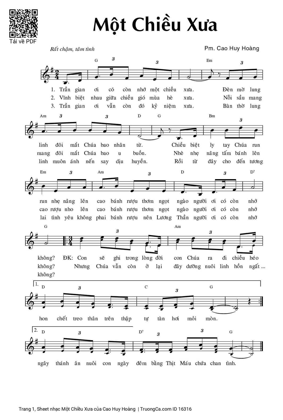 Chọn nút dấu + để tăng tông lên nửa cung, nút dấu - để giảm tông xuống nửa cung. Rê chuột vào hợp âm để xem các thế bấm hợp âm của bài hát Một Chiều Xưa.