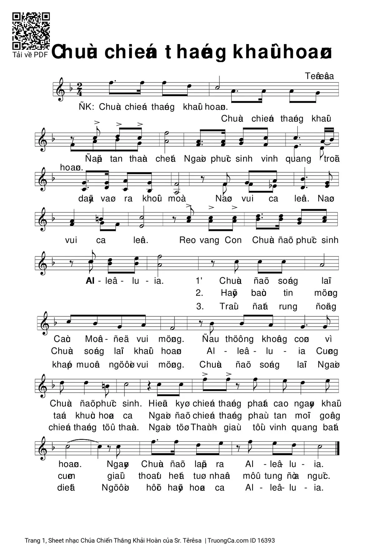 Điệp khúc. Chúa chiến thắng khải hoàn (Chúa chiến thắng khải hoàn) Đập tan thần chết. Ngài phục sinh vinh quang, trỗi dậy và ra khỏi mồ. Nào vui ca lên. Nào vui ca lên. Reo vang Con Chúa đã phục sinh. Al-le-lu-ia.