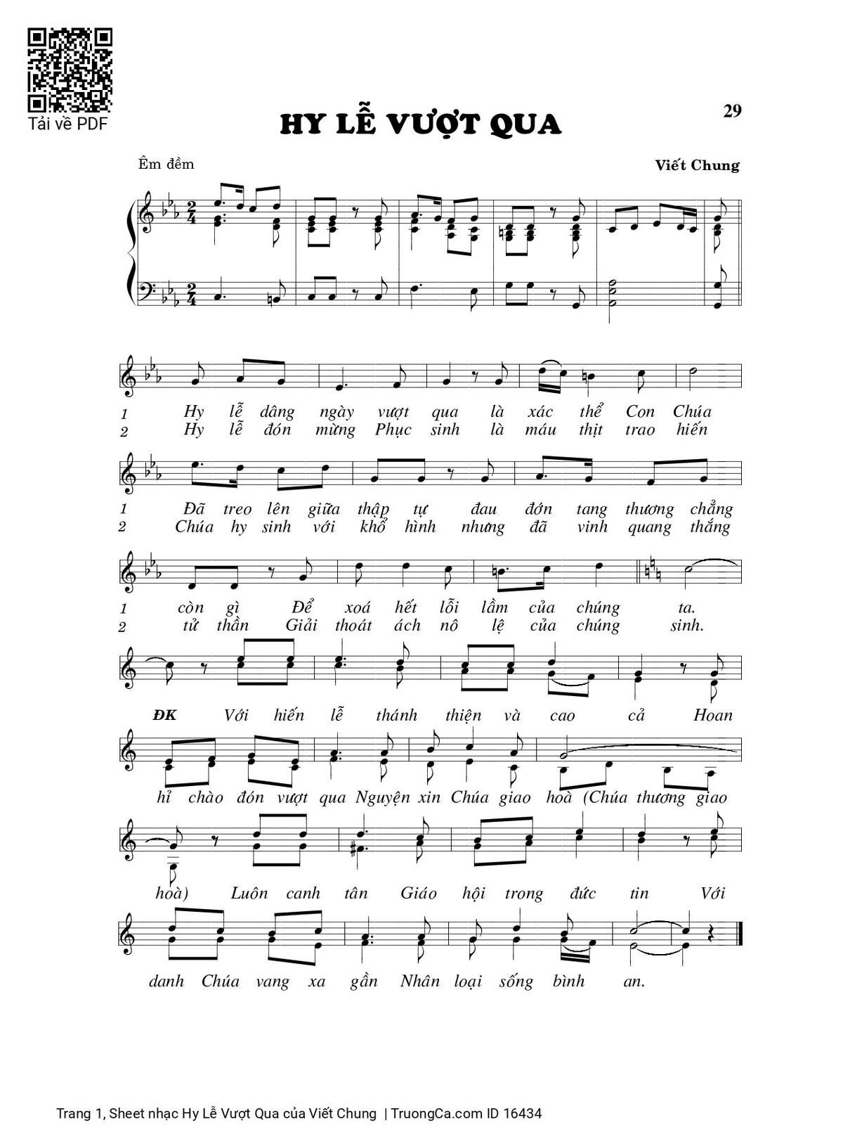 Điệp khúc. Với hiến lễ thánh thiện và cao cả, hoan hỉ chào Vượt Qua, nguyện xin Chúa giao hòa. (Chúa thương giao hòa) Luôn canh tân Giáo hội trong đức tin. Với Danh Chúa vang xa gần, nhân loại sống bình an.