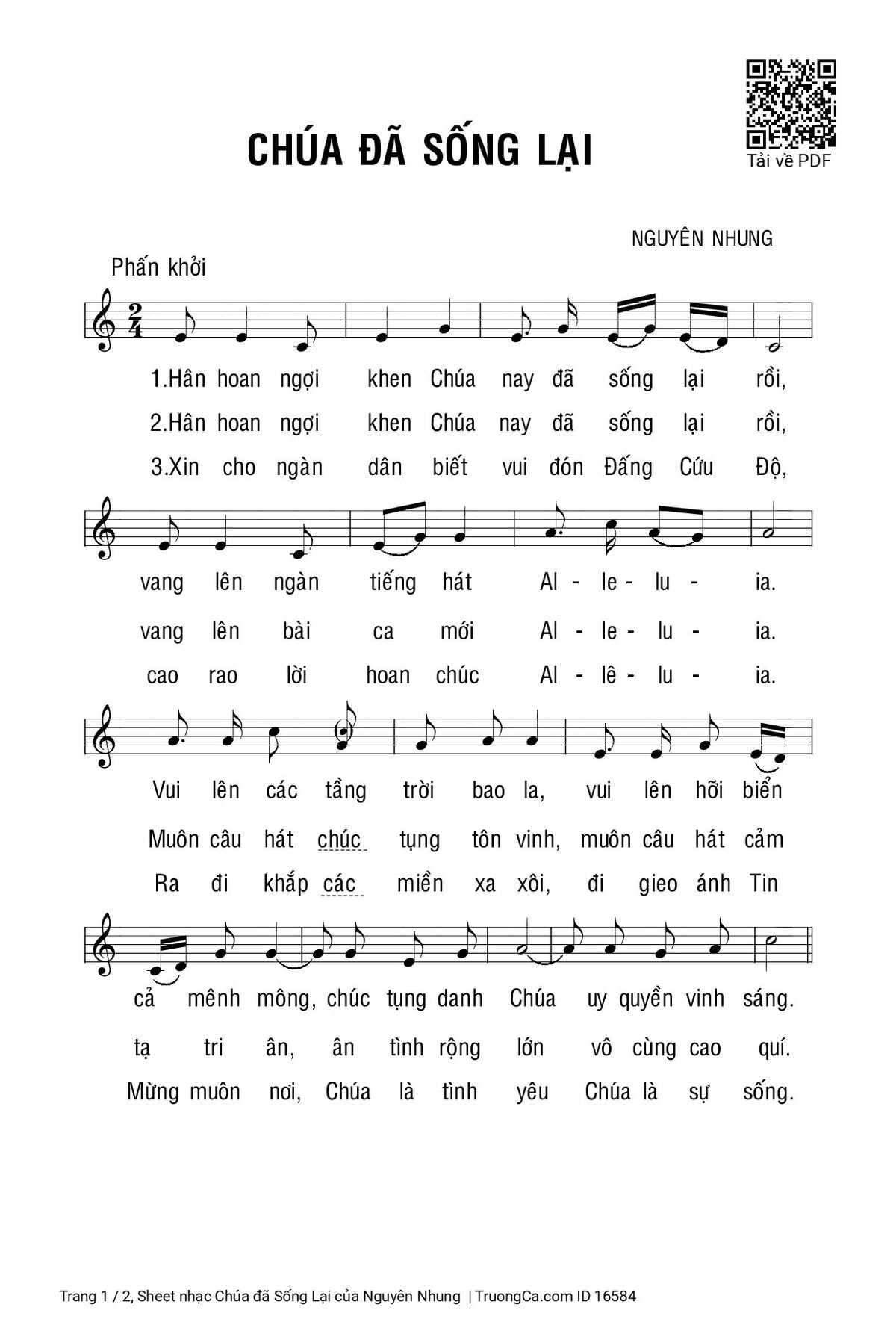 Điệp khúc: Chúa đã sống lại từ cõi chết, Chúa đã sống lại đầy vinh quang, xin cho muôn dân an lành sống trọn niềm thành tín. Chúa đã đến ban nguồn sống mới, Chúa chiếu ánh quang tràn muôn nơi, xin ban sức thiêng dạt dào đến mỗi người chúng con