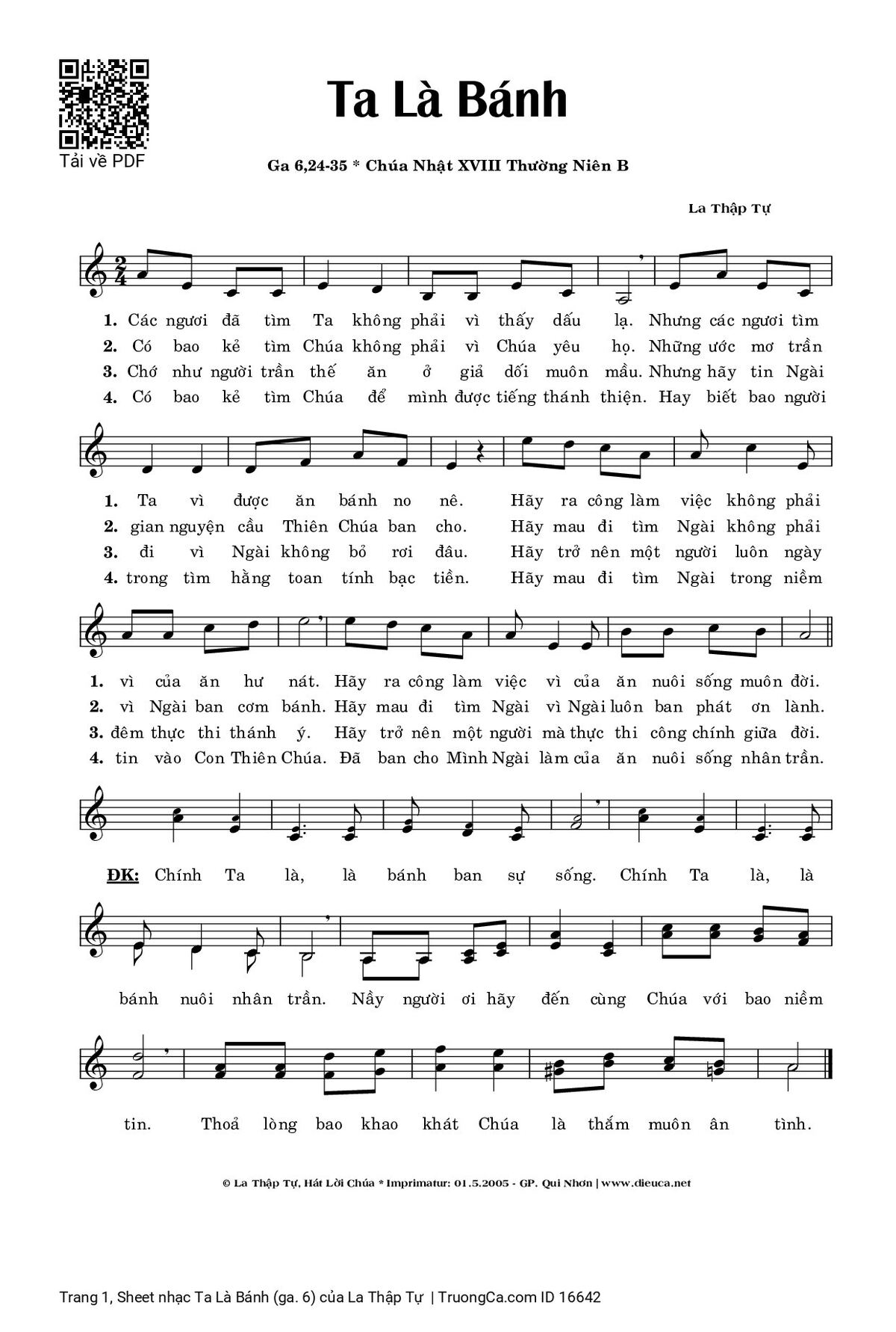 Điệp khúc: Chính Ta là, là bánh ban sự sống. Chính Ta là, là bánh nuôi nhân trần. Nầy người ơi hãy đến cùng Chúa với bao niềm tin. Thoả lòng bao khao khát Chúa là thắm muôn ân tình.