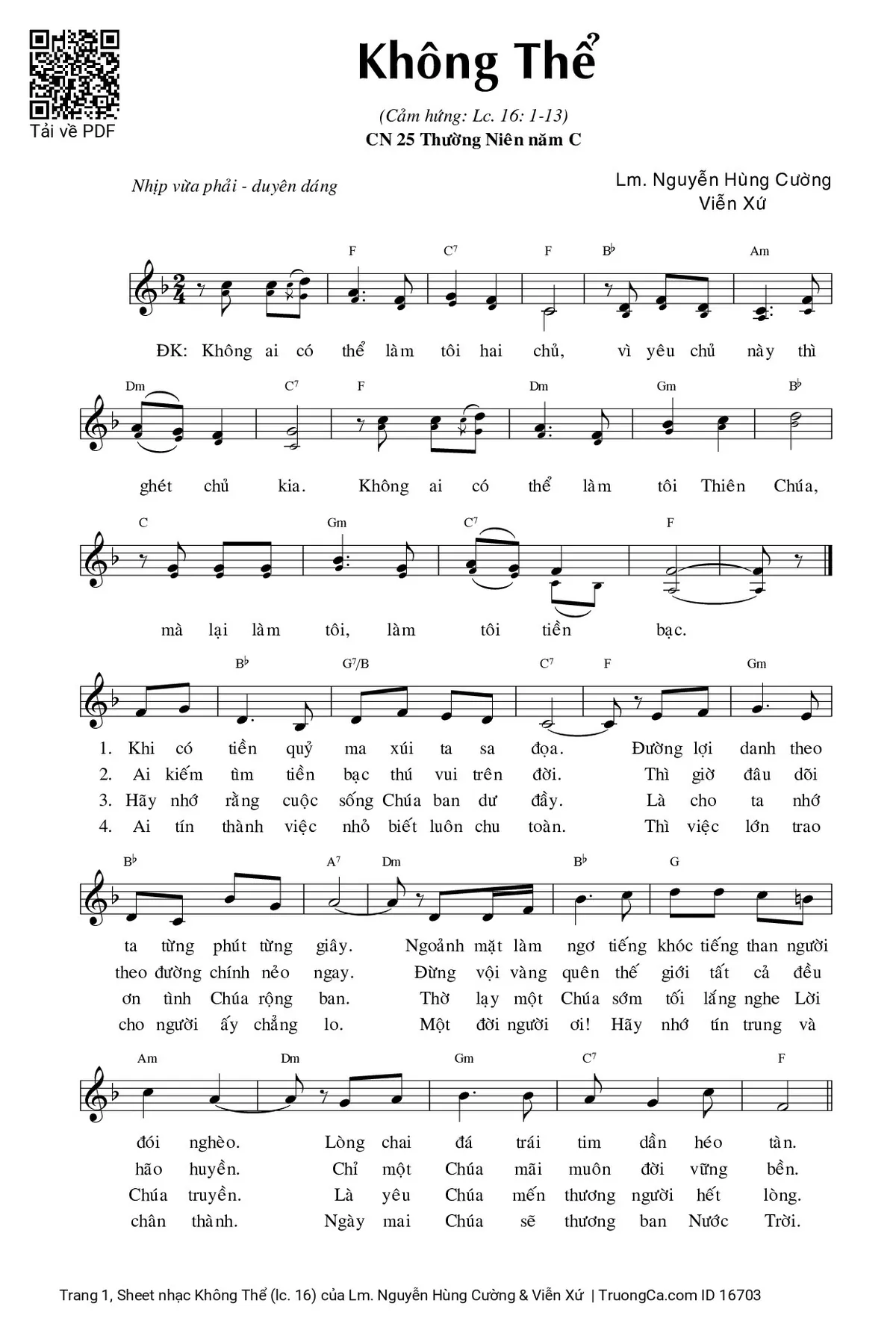 Chọn nút dấu + để tăng tông lên nửa cung, nút dấu - để giảm tông xuống nửa cung. Rê chuột vào hợp âm để xem các thế bấm hợp âm của bài hát Không Thể (lc. 16).