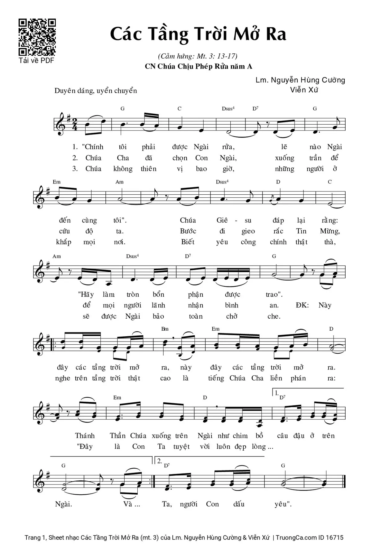 Điệp khúc. Này đây các tầng trời mở ra, này đây các tầng trời mở ra. Thánh Thần Chúa xuống trên Ngài như chim bồ câu đậu ở trên Ngài. Và nghe trên tầng trời thật cao là tiếng Chúa Cha liền phán ra: “Đây là Con Ta tuyệt vời luôn đẹp lòng Ta, người Con dấu yêu”.