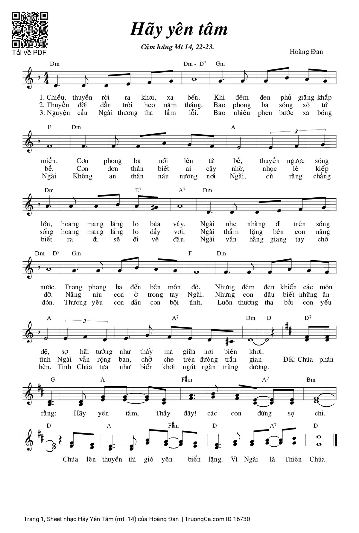 Điệp khúc. Chúa phán rằng: Hãy yên tâm, Thầy đây! Các con đừng sợ chi. Chúa lên thuyền thì gió yên biển lặng. Vì Ngài là Thiên Chúa.