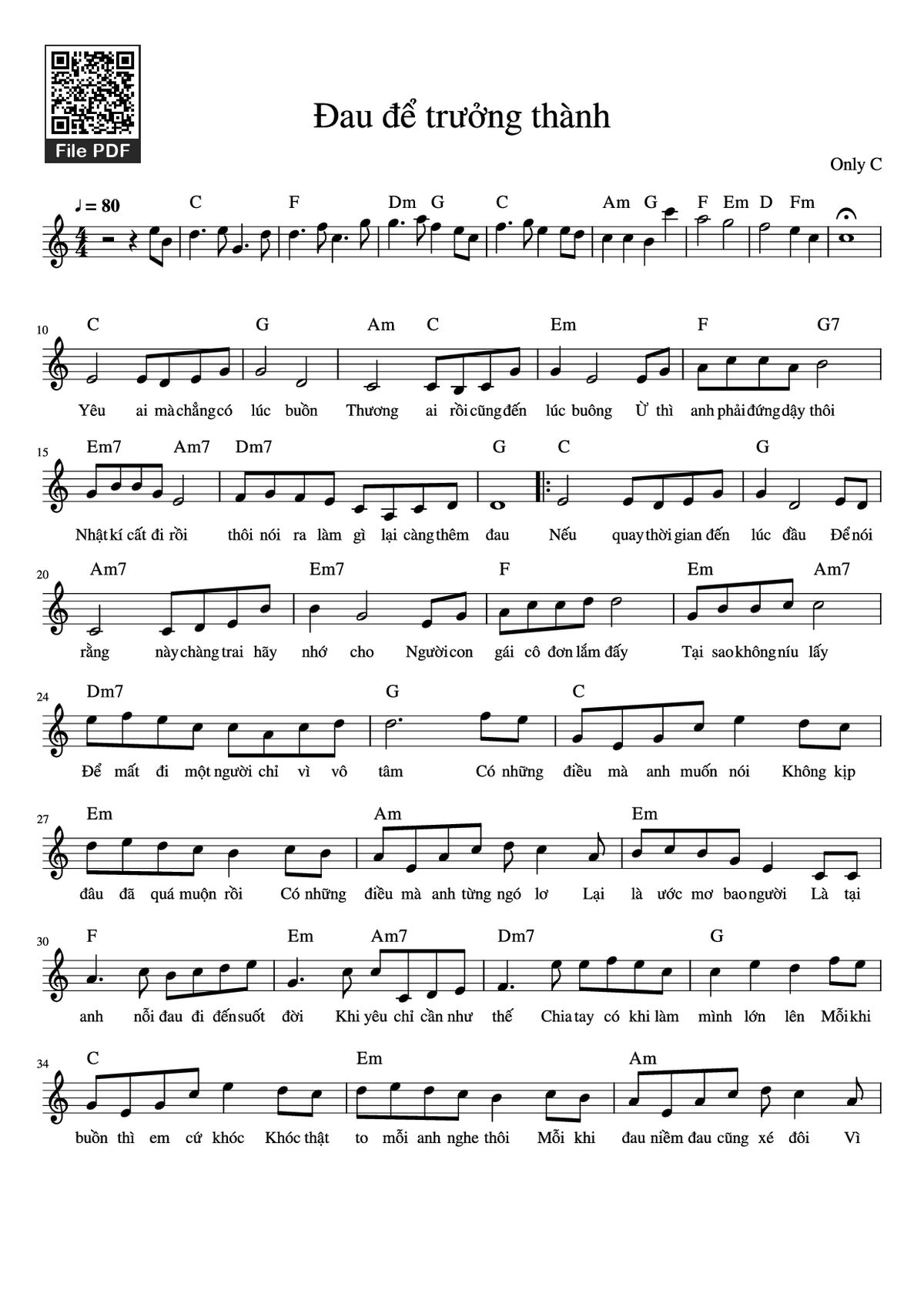Chọn nút dấu + để tăng tông lên nửa cung, nút dấu - để giảm tông xuống nửa cung. Rê chuột vào hợp âm để xem các thế bấm hợp âm của bài hát Đau để trưởng thành.