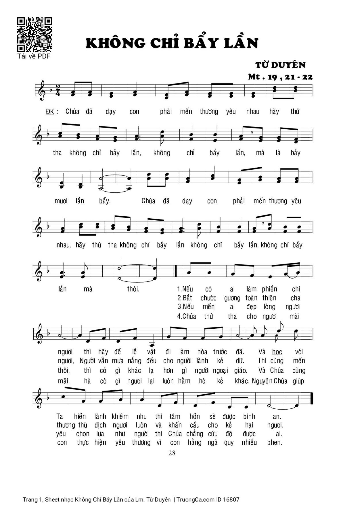 Điệp khúc. Chúa đã dạy con phải mến thương yêu nhau hãy thứ tha không chỉ bảy lần, không chỉ bảy lần, mà là bảy mươi lần bảy. Chúa đã dạy con phải mến thương nhau hãy thứ tha không chỉ bảy lần, không chỉ bảy lần, không chỉ bảy lần mà thôi.