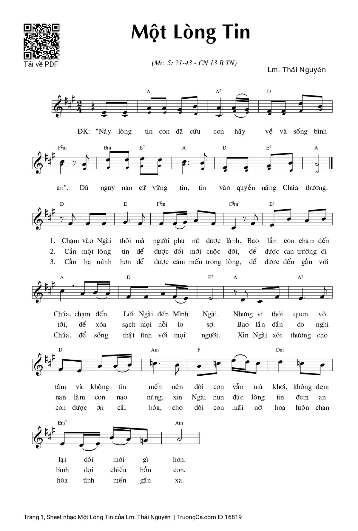 Chọn nút dấu + để tăng tông lên nửa cung, nút dấu - để giảm tông xuống nửa cung. Rê chuột vào hợp âm để xem các thế bấm hợp âm của bài hát Một Lòng Tin.