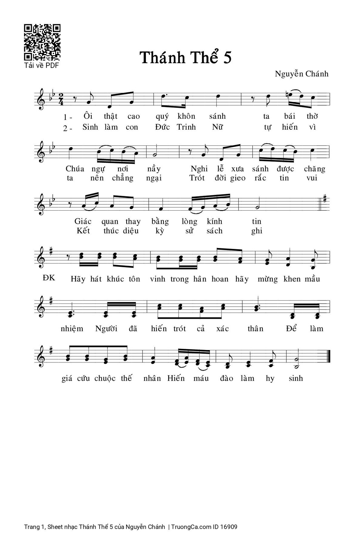 Chọn nút dấu + để tăng tông lên nửa cung, nút dấu - để giảm tông xuống nửa cung. Rê chuột vào hợp âm để xem các thế bấm hợp âm của bài hát Thánh Thể 5.