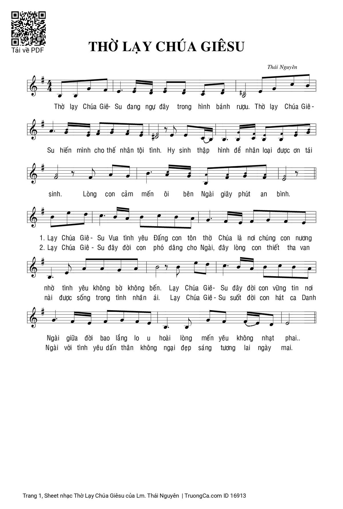 Điệp khúc. Thờ lạy Chúa Giêsu trong Nhiệm Tích Thánh Thể cao vời. Thờ lạy Chúa Giêsu hiến mình cho thế nhân tội lỗi. Hy sinh thập hình để nhân loại được ơn tái sinh, lòng con cảm mến sống bên Ngài hạnh phúc muôn đời.
