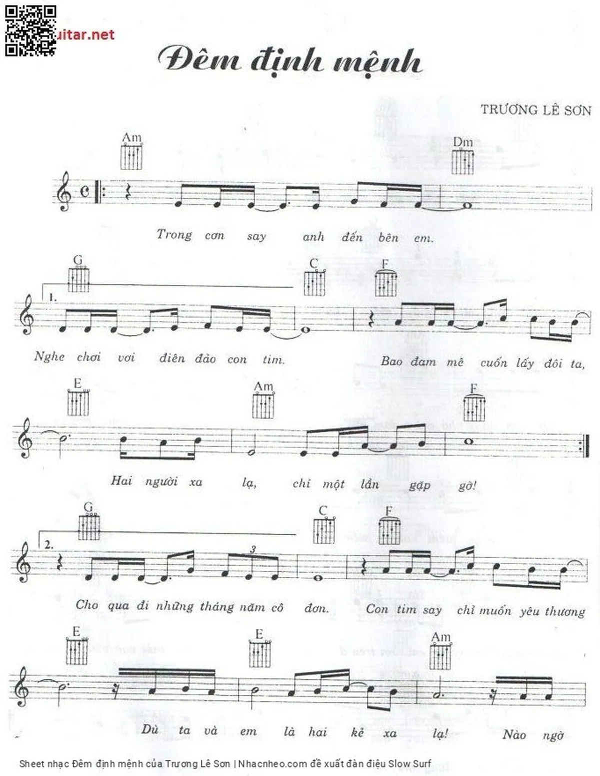 Chọn nút dấu + để tăng tông lên nửa cung, nút dấu - để giảm tông xuống nửa cung. Rê chuột vào hợp âm để xem các thế bấm hợp âm của bài hát Đêm định mệnh.