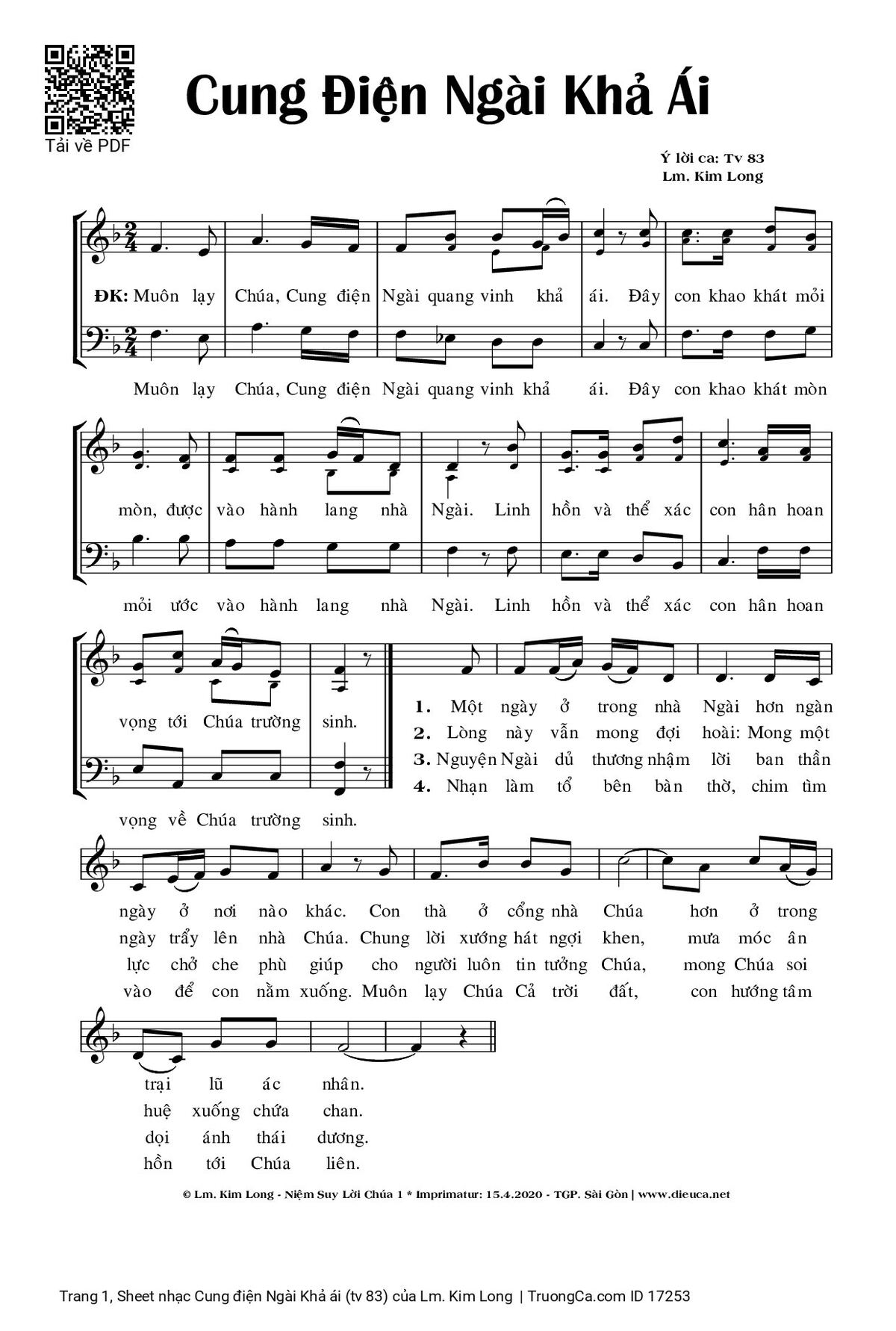 Điệp khúc: Muôn lạy Chúa, Cung điện Ngài quang vinh khả ái. Đây con khao khát mỏi mòn, được vào hành lang nhà Ngài. Linh hồn và thể xác con hân hoan vọng tới Chúa trường sinh.