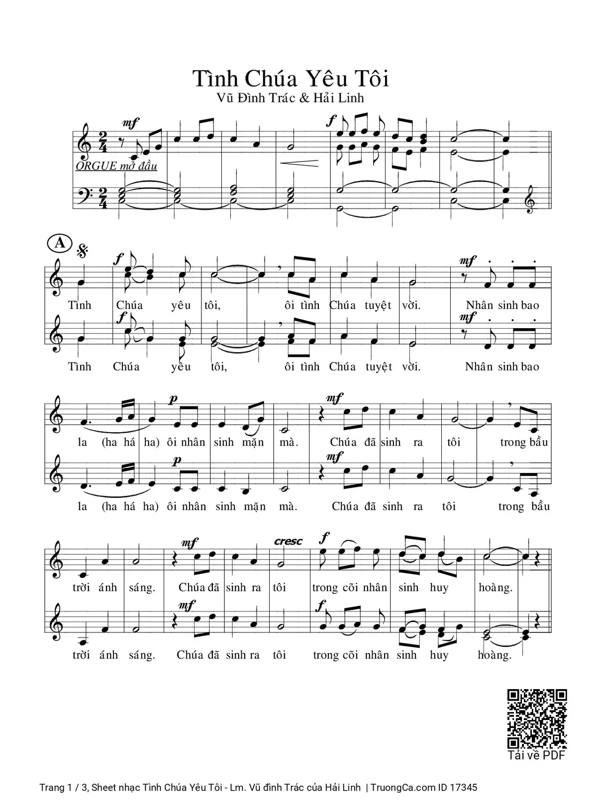 Điệp khúc A. Tình Chúa yêu tôi ôi tình Chúa tuyệt vời! Nhân sinh bao la ôi nhân sinh mặn mà. Chúa đã sinh ra tôi trong bầu trời ánh sáng. Chúa đã sinh ra tôi trong cõi nhân sinh huy hoàng.