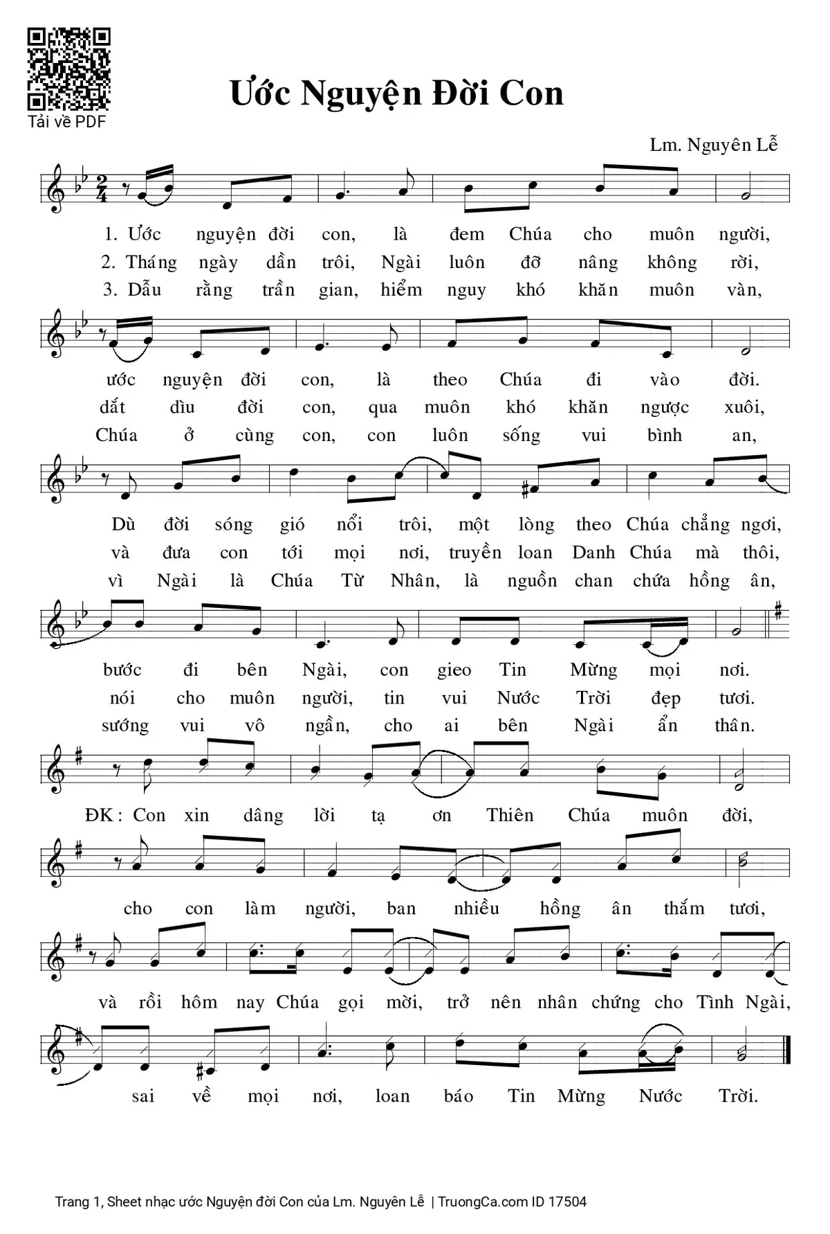 1/ Ước nguyện đời con, là đem Chúa cho muôn người. Ước nguyện đời con, là theo Chúa đi vào đời, Dù đời sóng gió nổi trôi, Một lòng theo Chúa chẳng ngơi, Bước đi bên Ngài, con gieo Tin Mừng mọi nơi.