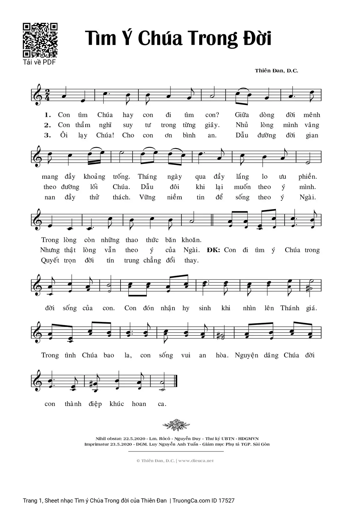 Điệp khúc: Con đi tìm ý Chúa trong đời sống của con. Con đón nhận hy sinh khi nhìn lên Thánh giá. Trong tình Chúa bao la, con sống vui an hòa. Nguyện dâng Chúa đời con thành điệp khúc hoan ca.