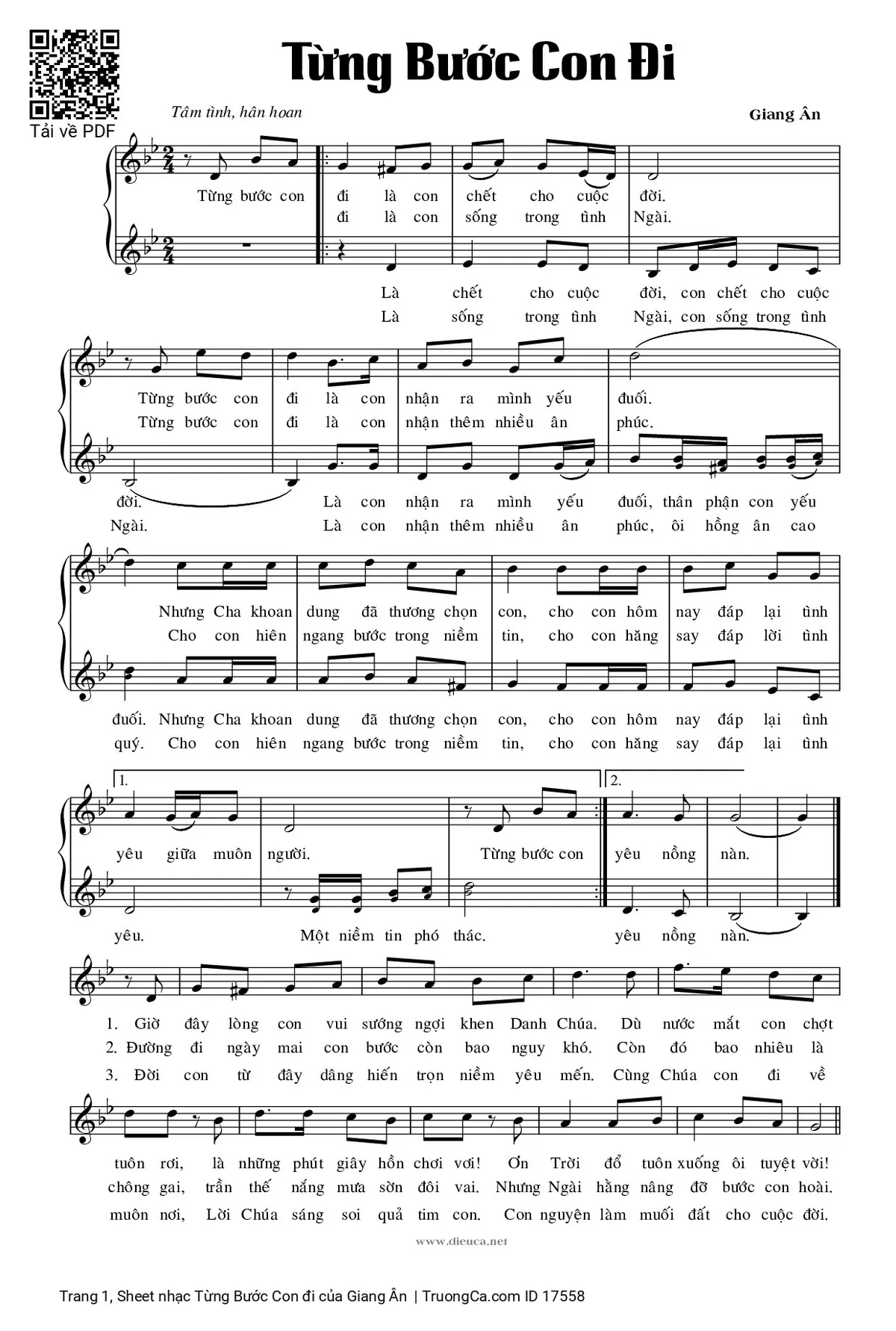 Điệp khúc: Từng bước con đi là con chết cho cuộc đời. Từng bước con đi là con nhận ra mình yếu đuối. Nhưng Cha khoan dung đã thương chọn con, cho con hôm nay đáp lại tình yêu giữa muôn người (một niêm tin phó thác). Từng bước con đi là con sống trong tình Ngài. Từng bước con đi là con nhận thêm nhiều ân phúc. Cho con hiên ngang bước trong niềm tin, cho con hăng say đáp lời tình yêu nồng nàn.