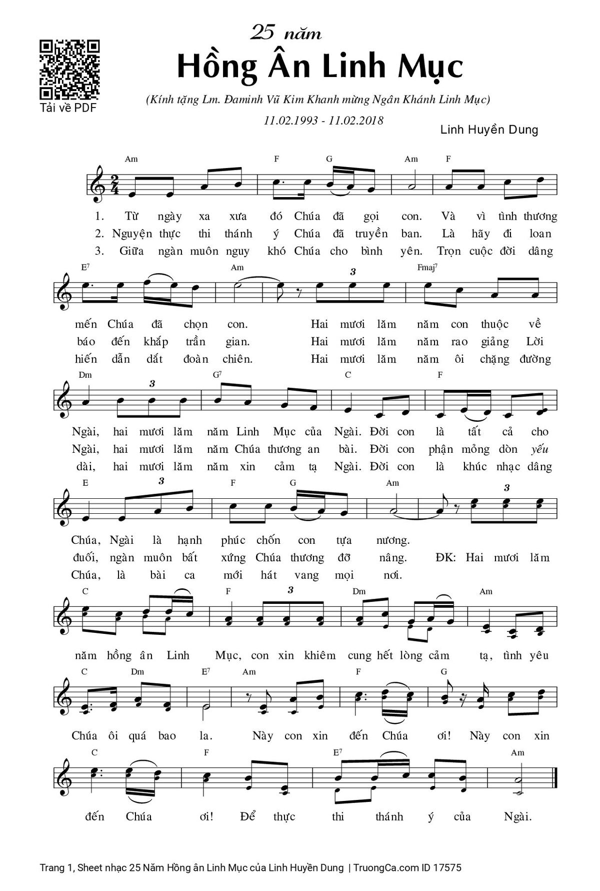 3. Giữa ngàn muôn nguy khó Chúa cho bình yên. Trọn cuộc đời dâng hiến dẫn dắt đoàn chiên. Hai mươi lăm năm ôi chặng đường dài, hai mươi lăm năm xin cảm tạ Ngài. Đời con là khúc nhạc dâng Chúa, là bài ca mới hát vang mọi nơi.
