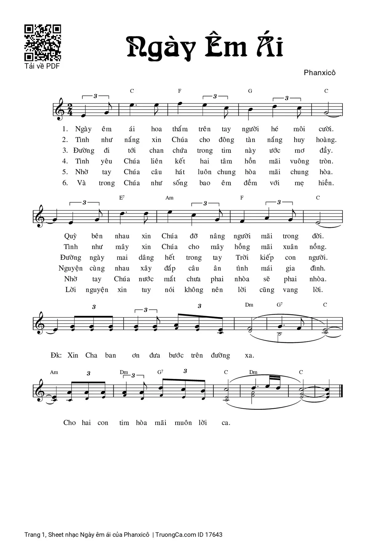 1. Ngày êm ái, hoa thắm trên tay người hé môi cười. Quỳ bên nhau xin Chúa đỡ nâng người mãi muôn đời.