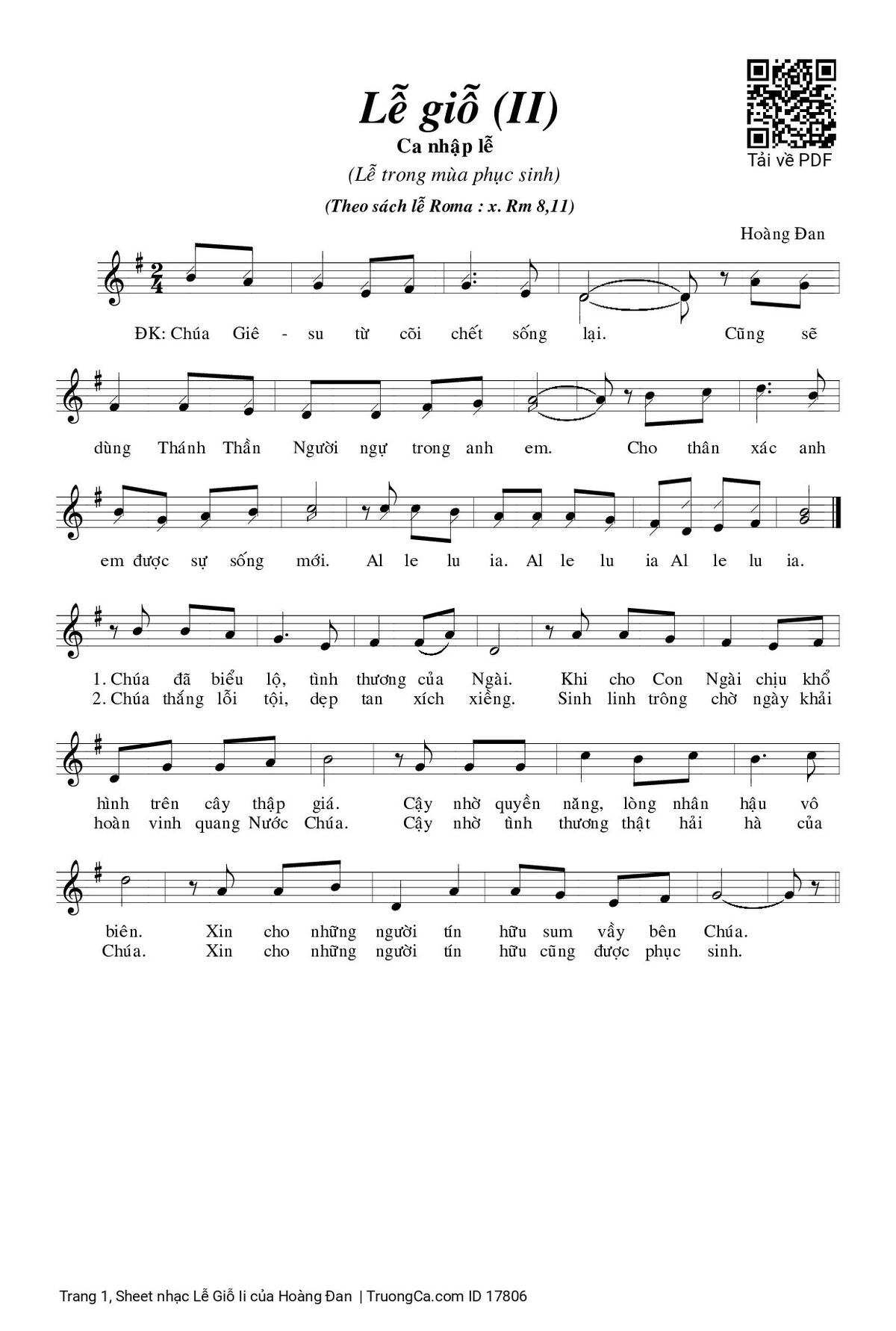 Điệp khúc. Chúa Giêsu từ cõi chết sống lại cũng sẽ dùng Thánh Thần Người ngự trong anh em. Cho thân xác anh em được sự sống mới. Alleluia - Alleluia – Alleluia.