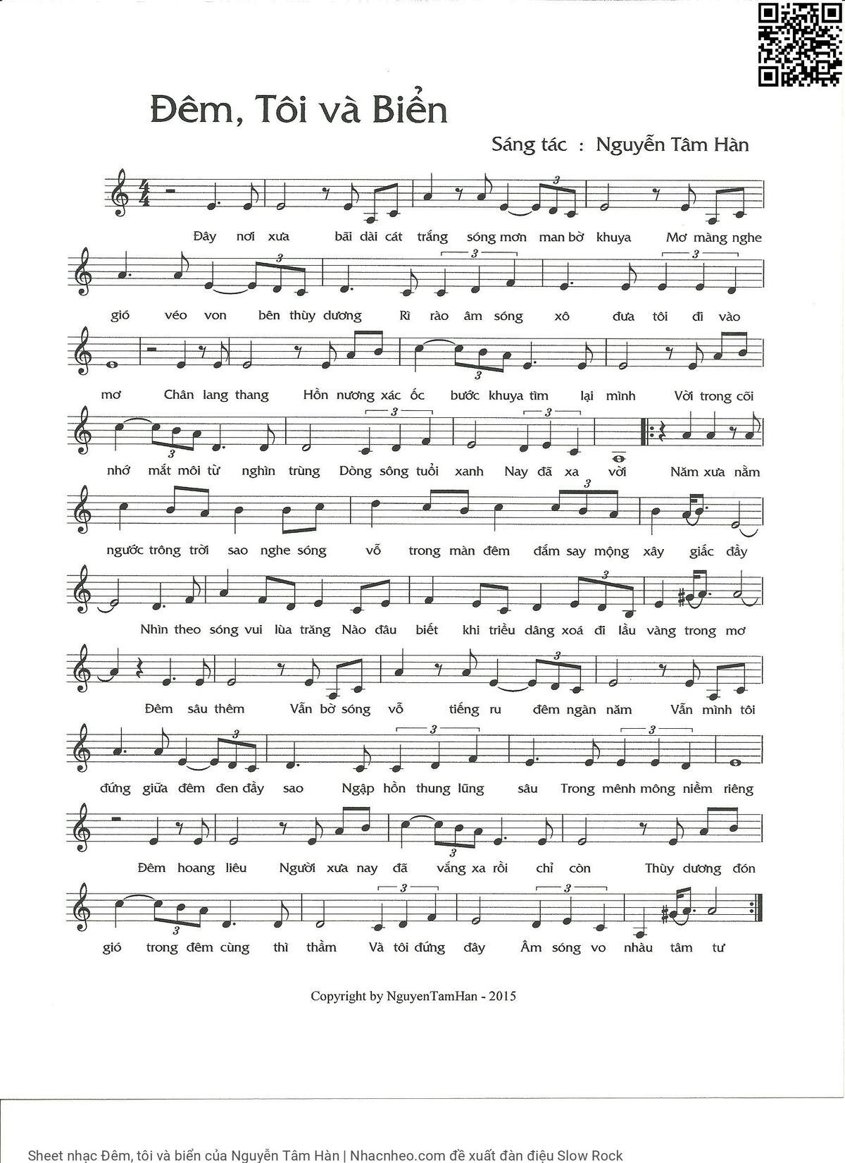 Chọn nút dấu + để tăng tông lên nửa cung, nút dấu - để giảm tông xuống nửa cung. Rê chuột vào hợp âm để xem các thế bấm hợp âm của bài hát Đêm, tôi và biển.