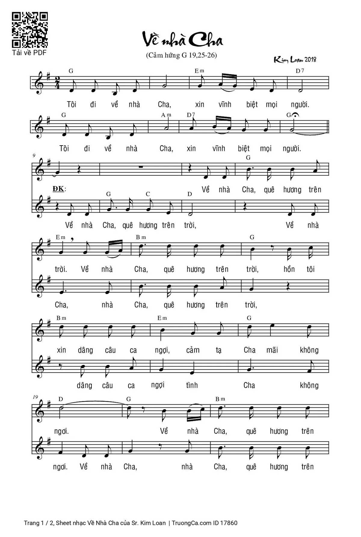 Điệp khúc. Tôi đi về nhà Cha xin vĩnh biệt mọi người, tôi đi về nhà Cha xin vĩnh biệt mọi người. . Về nhà Cha quê hương trên trời, về nhà Cha quê hương trên trời, hồn tôi xin dâng câu ca ngợi cảm tạ Cha mãi không ngơi. . Về nhà Cha quê hương trên trời trọn đời tôi tin yêu mong đợi, Người là Cha nhân ái xót thương đón tôi vào bến bờ yêu thương.