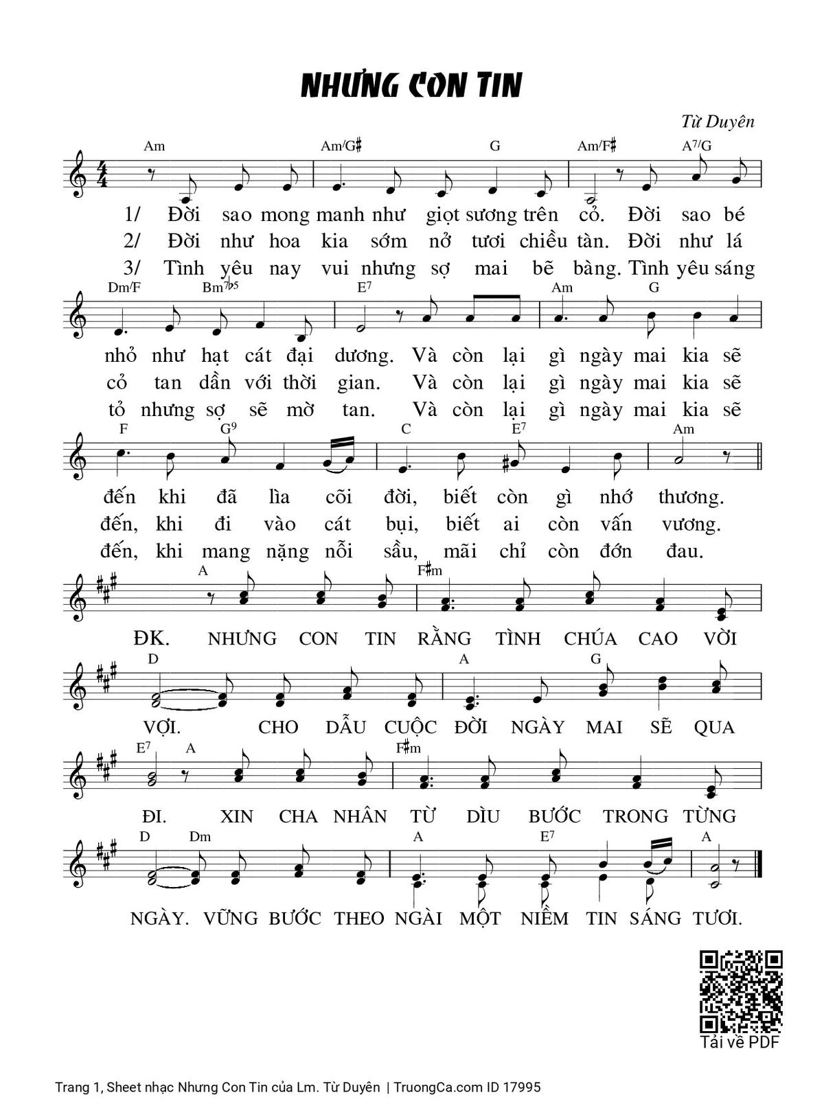 Điệp khúc. Nhưng con tin rằng tình Chúa cao vời vợi. Cho dẫu cuộc đời ngày mai sẽ qua đi. Xin Cha nhân từ dìu bước trong từng ngày. Vững bước theo Ngài một niềm tin sáng tươi.
