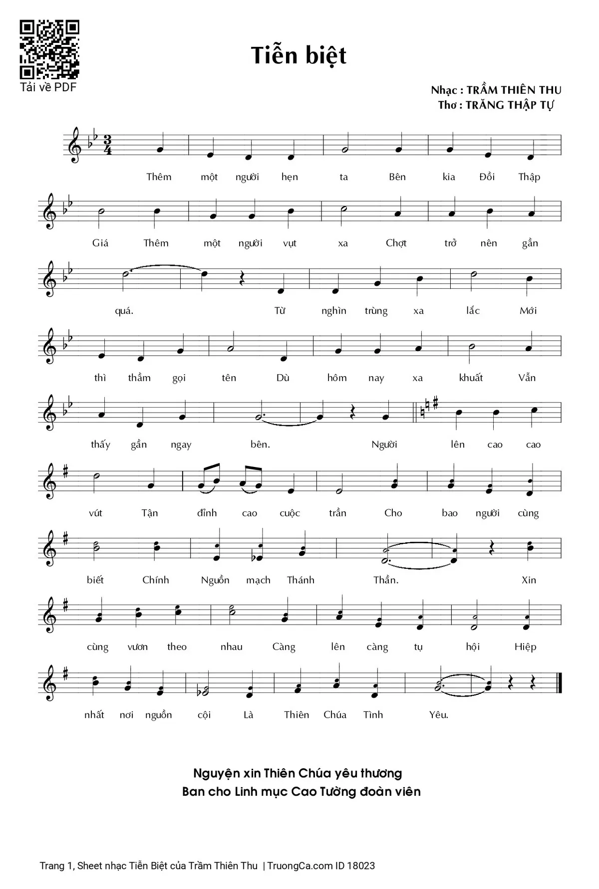 Sheet nhạc có nốt Tiễn Biệt của nhạc sĩ Trầm Thiên Thu và file PDF nốt nhạc đăng lên đây nhằm giúp các bạn xướng âm cho đúng nốt và hát thêm hay, chỉ mang tính chất tham khảo, không có mục đích thương mại. Bản quyền thuộc về tác giả và tổ chức nắm bản quyền, Truongca.com không giữ bất kỳ bản quyền của nội dung nào cả. Các bạn có thể tải về bản PDF chất lượng cao, gồm khuông nhạc có nốt với đường link file PDF bên trên.