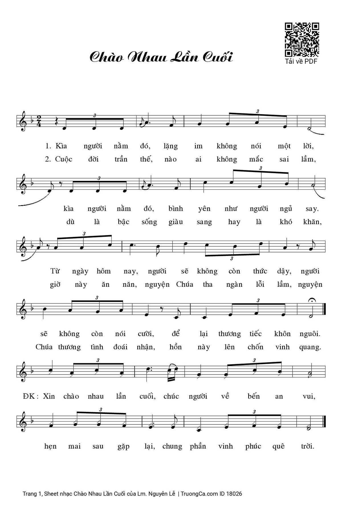 1. Kìa người nằm đó, lặng im không nói một lời, kìa người nằm đó, bình yên như người ngủ say. Từ ngày hôm nay, người sẽ không còn thức dậy, người sẽ không còn nói cười, để lại thương tiếc khôn nguôi.