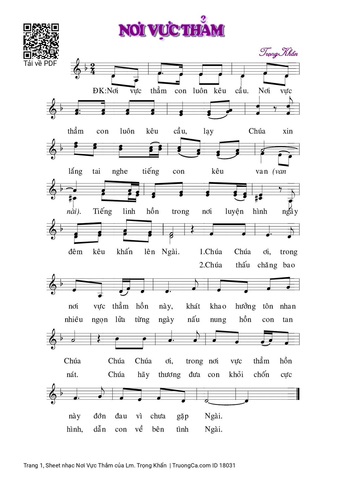 Điệp khúc. Nơi vực thẳm con luôn kêu cầu. Nơi vực thẳm con luôn kêu cầu, lạy Chúa xin lắng tai nghe tiếng con kêu van . Tiếng linh hồn trong nơi luyện hình ngày đêm kêu khấn lên Ngài.