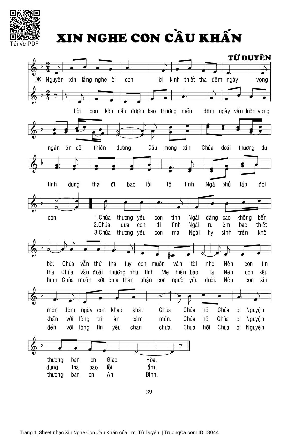 Điệp khúc. Nguyện xin lắng nghe lời con lời kinh thiết tha đêm ngày vọng ngân lên cõi thiên đường. Cầu mong xin Chúa đoái thương dủ tình dung tha đi bao lỗi tội tình Ngài phủ lấp đời con.